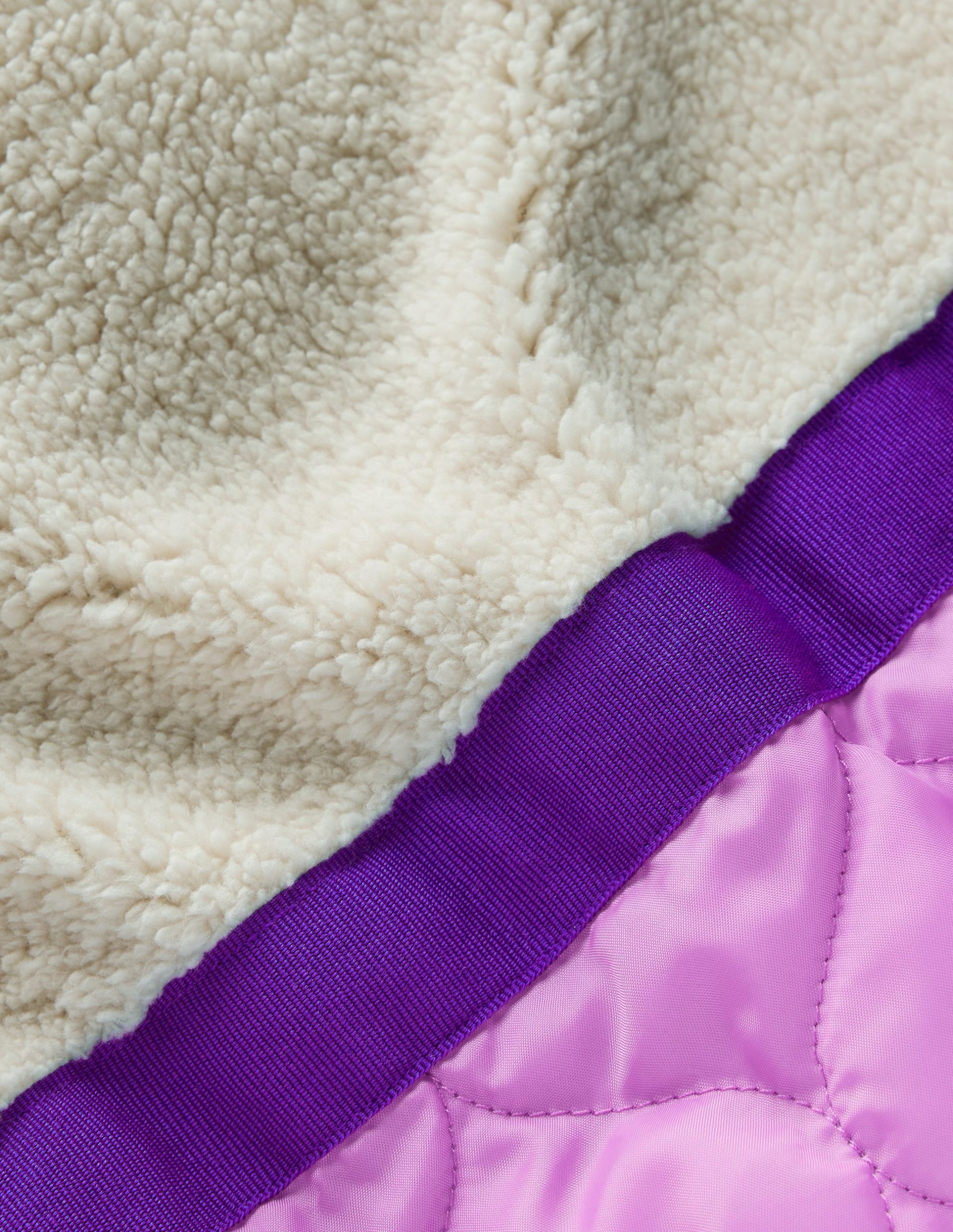 This hooded faux sherpa-lined padded coat is something special. Until it gets really cold zip off the sleeves and et voila! It’s a gilet all set for warmer jaunts. There’ll be no missing its bold colour and metallic purple strip in the park.