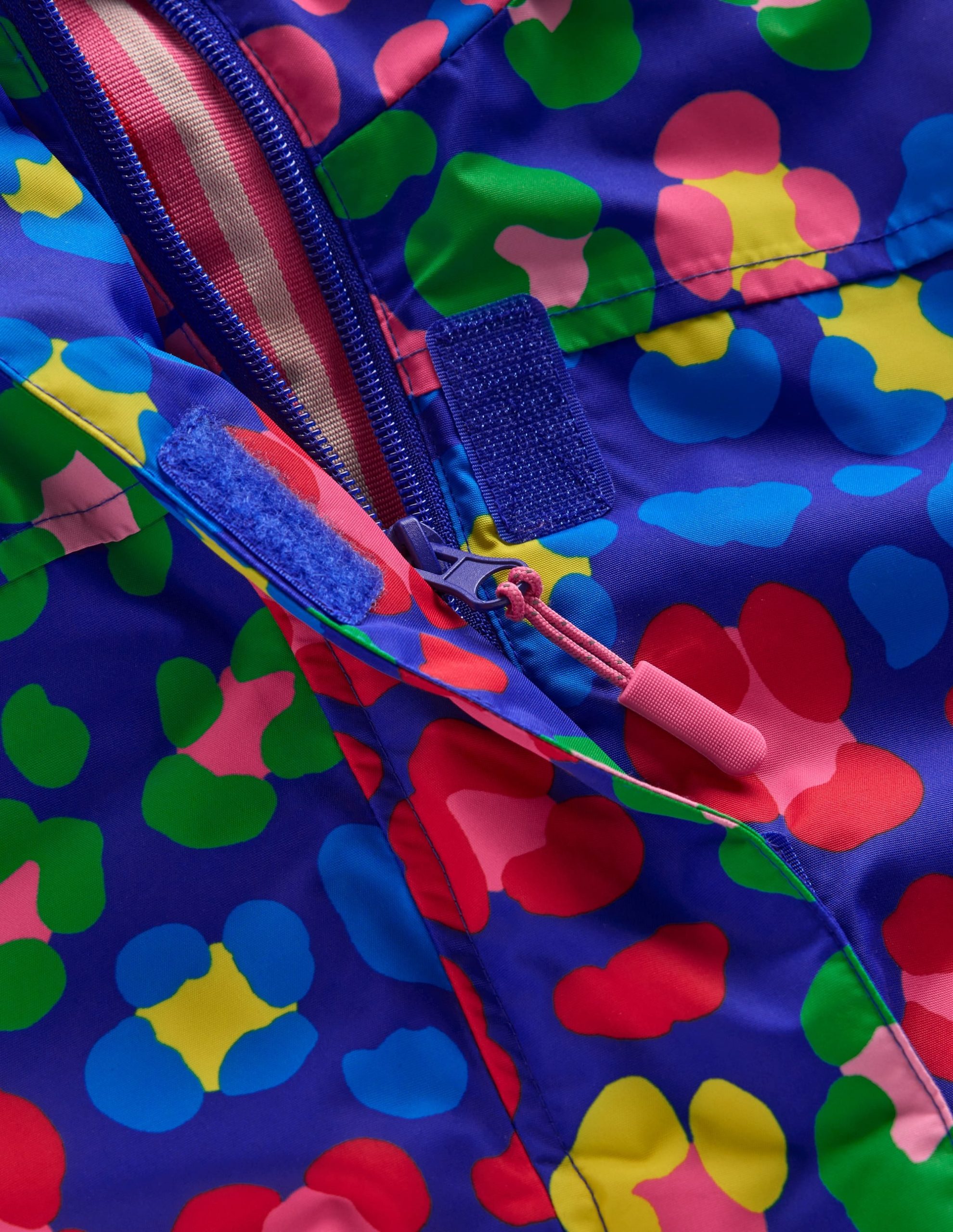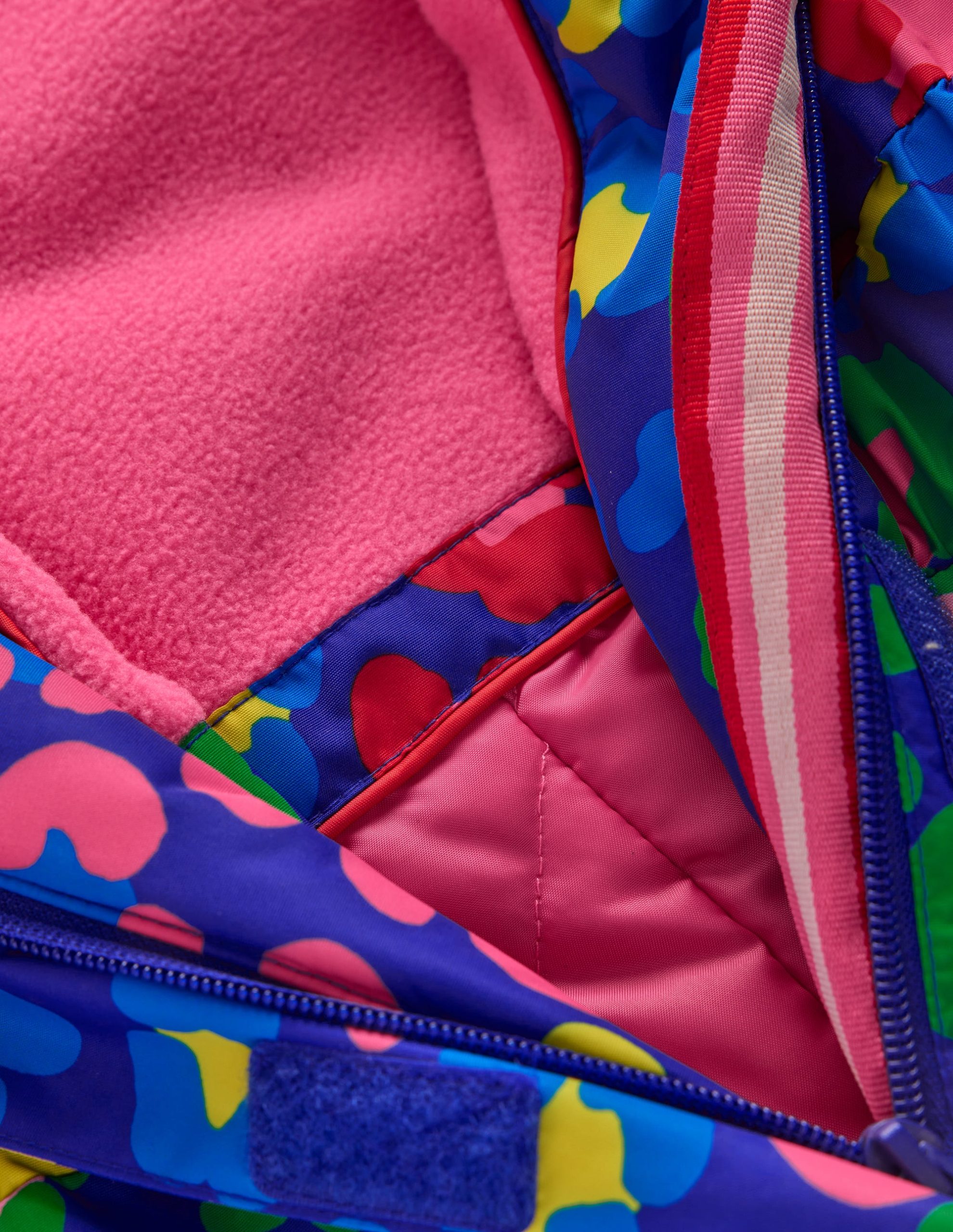 This all-in-one ski suit is nursery slope ready. Fully lined with soft fleece. it has lots of mountain-friendly features: a lift pass pocket. storm guards (to tuck into ski boots) and reflective piping among others. Look out for the matching rainbow mittens.