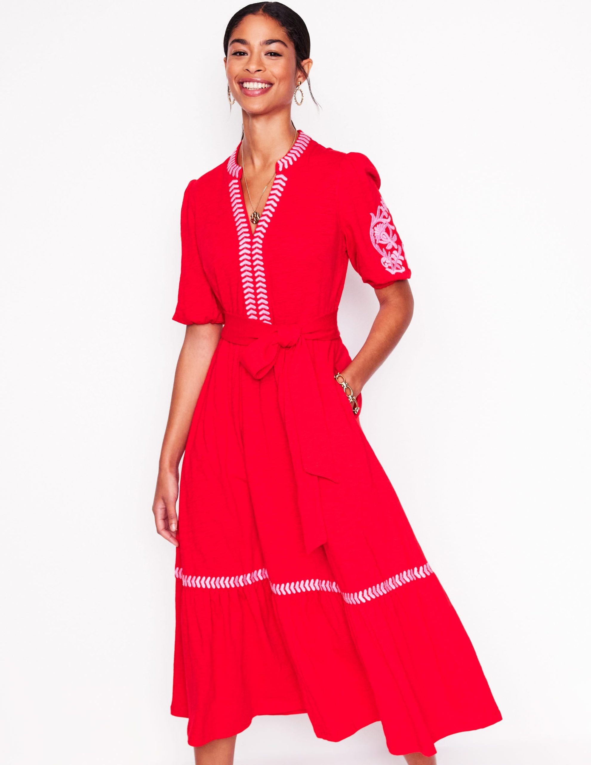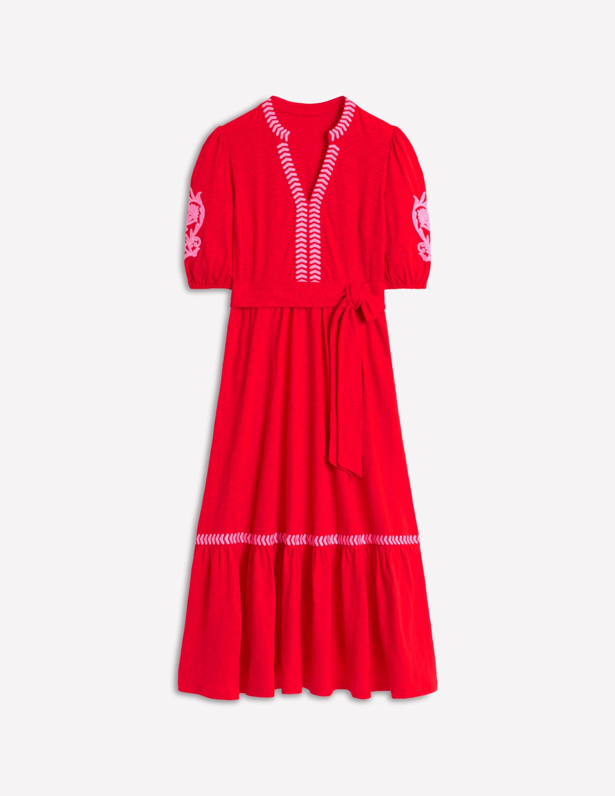 Amara Embroidered Jersey Dress-Poppy Red. Pink Peony