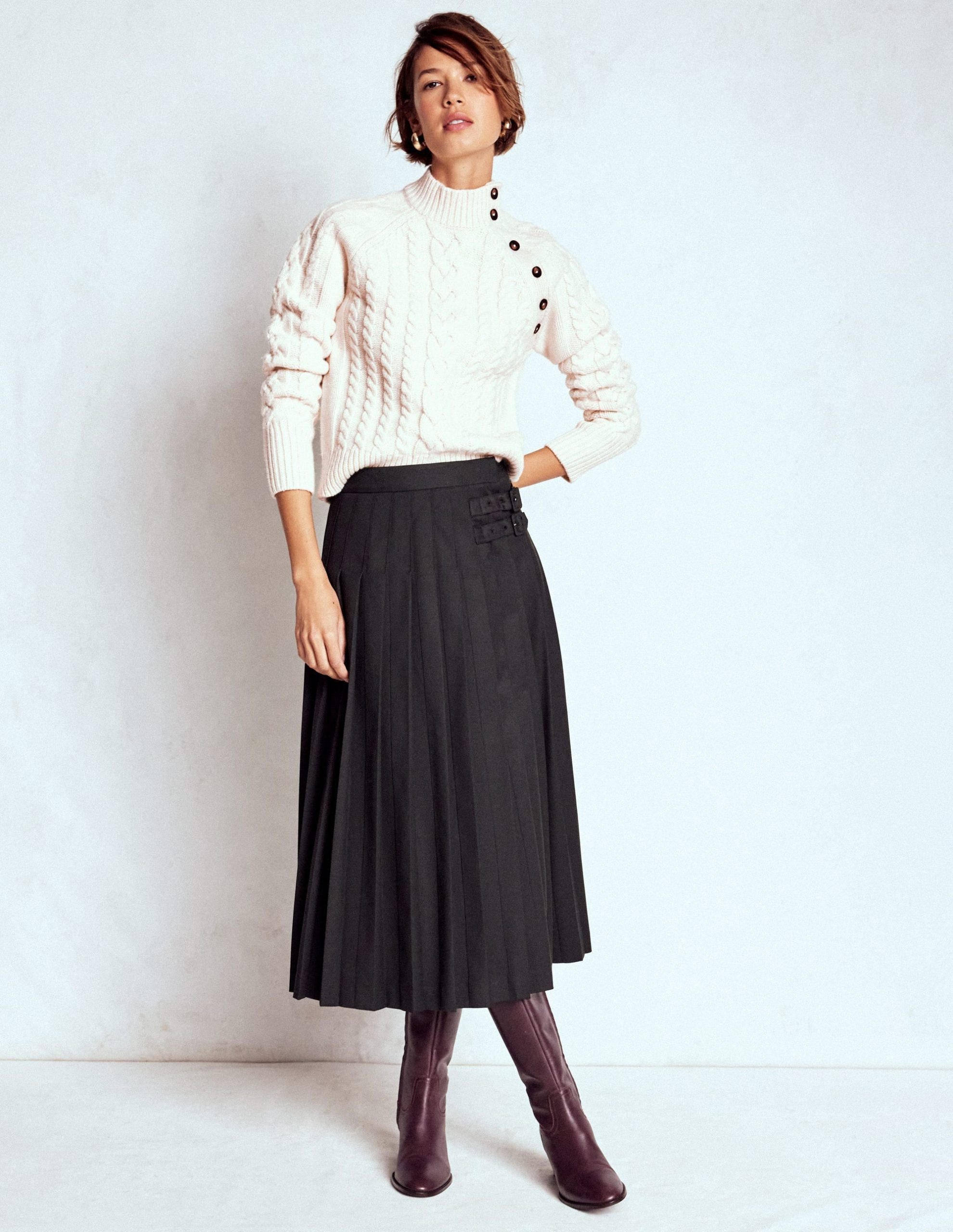 This chunky cable knit jumper with a high neck and button detail acts as a love letter to cold crisp mornings. Pair it with cords or a tartan kilt and set the tone for early morning coffee runs and last minute dinner plans.
