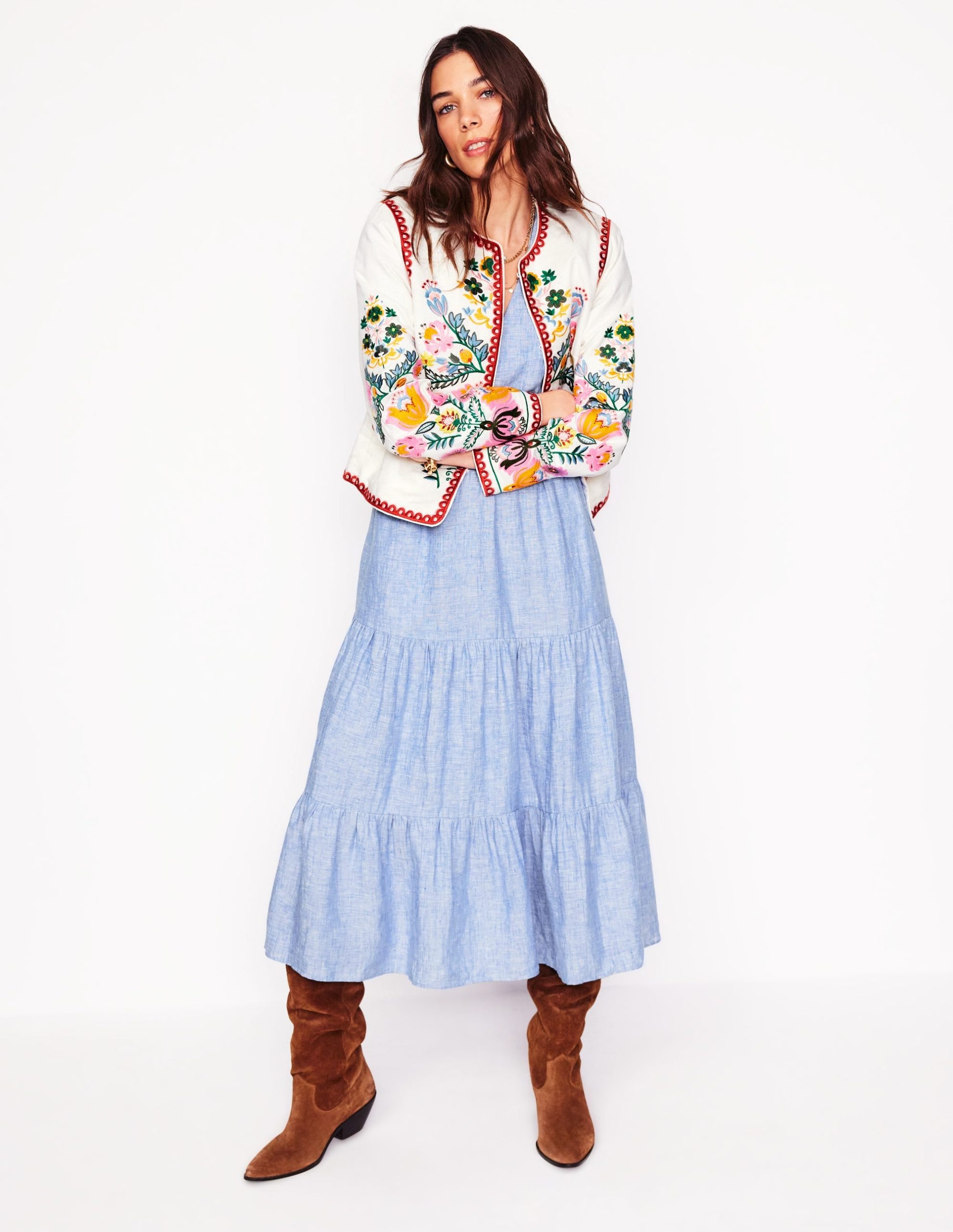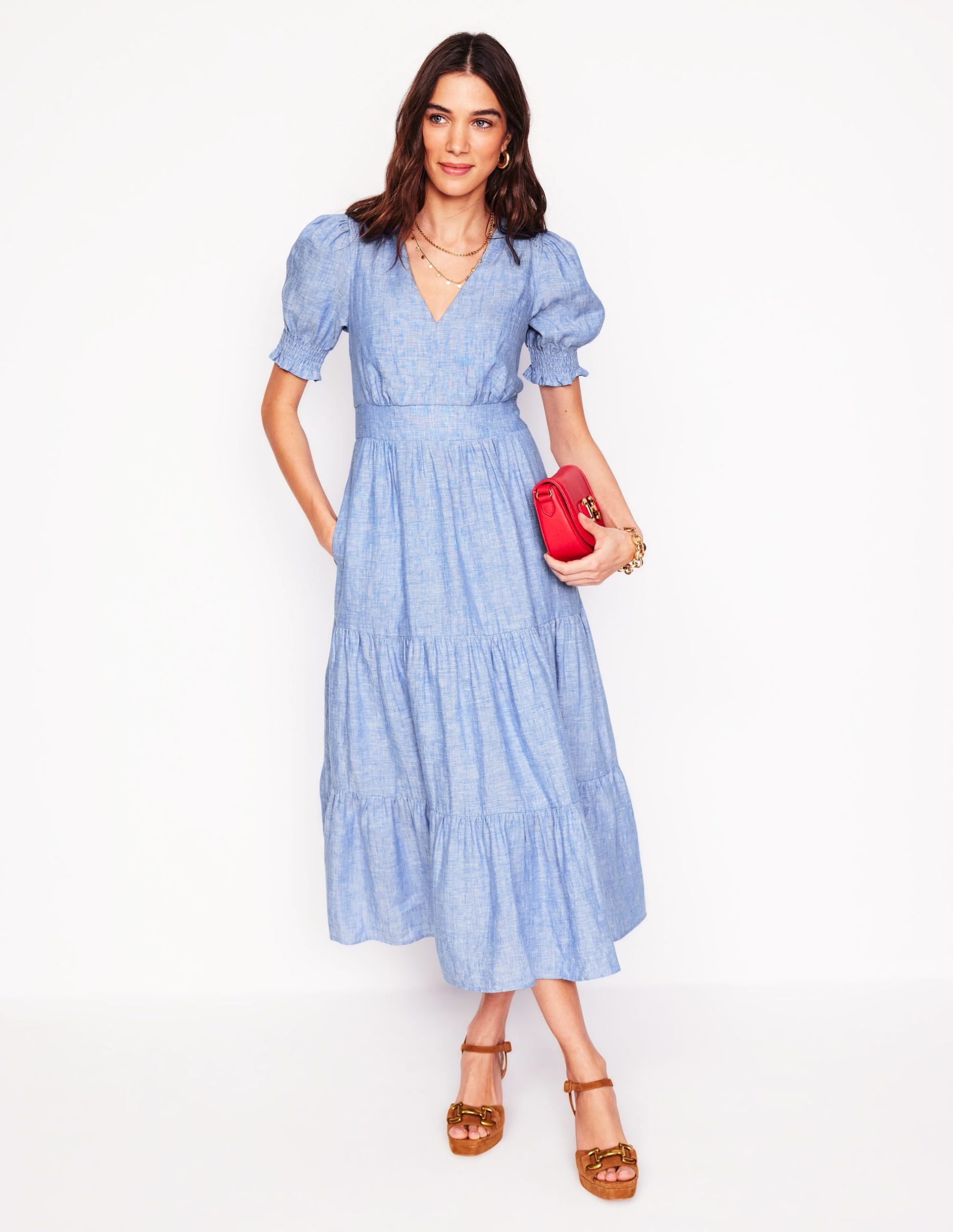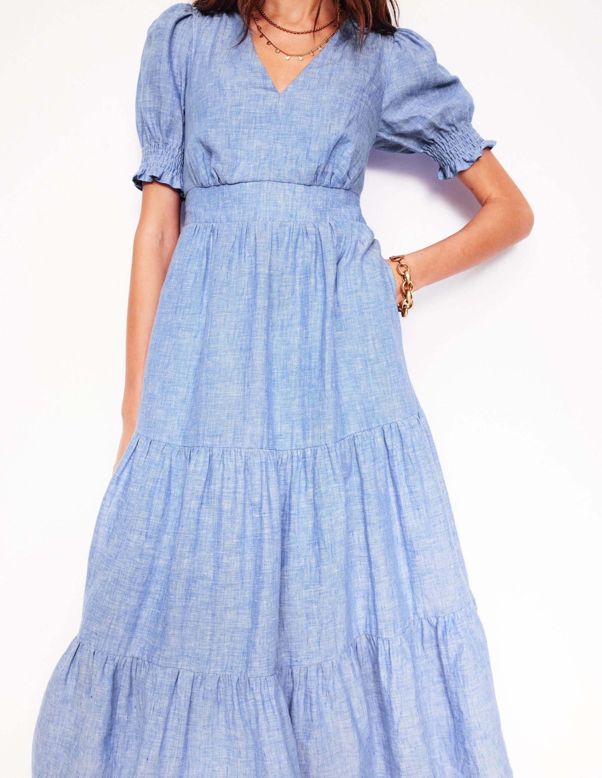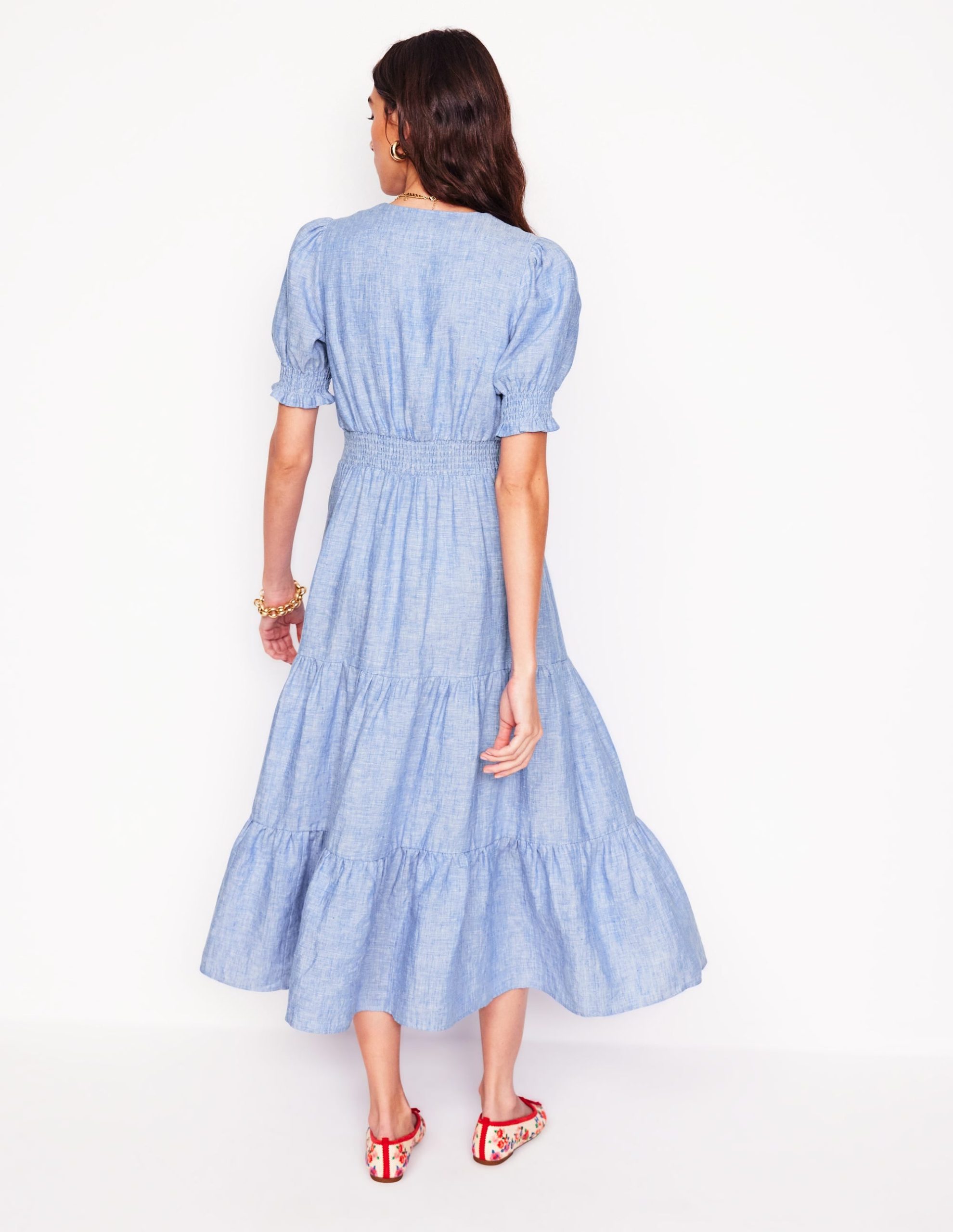Anna Linen Tiered Midi Dress-Summer Blue Chambray