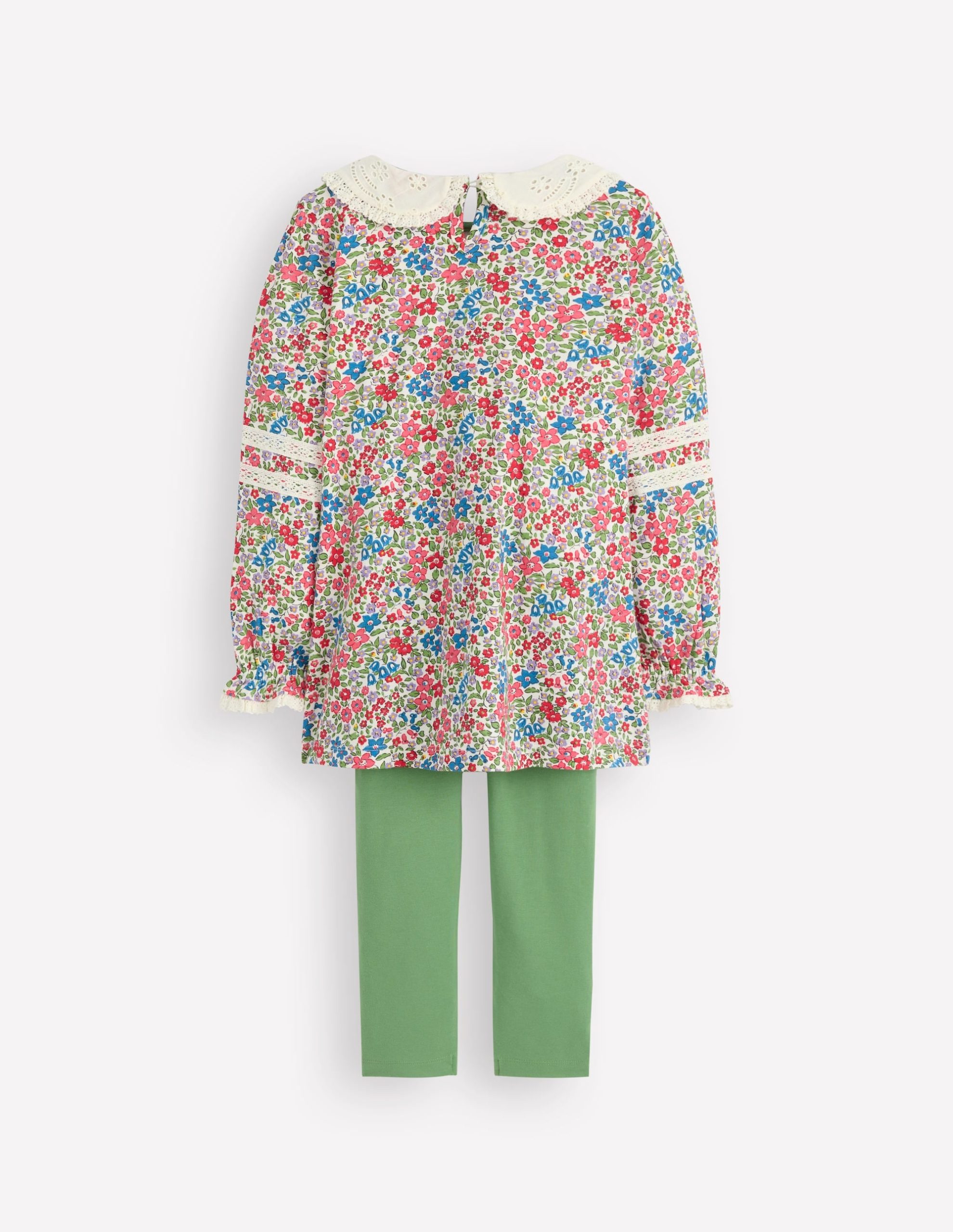 A dreamy outfit all in one. Minis will be fun ready in this vintage floral print tunic with broderie lace collar and cuffs. The soft cotton leggings are perfect for skips and leaps.