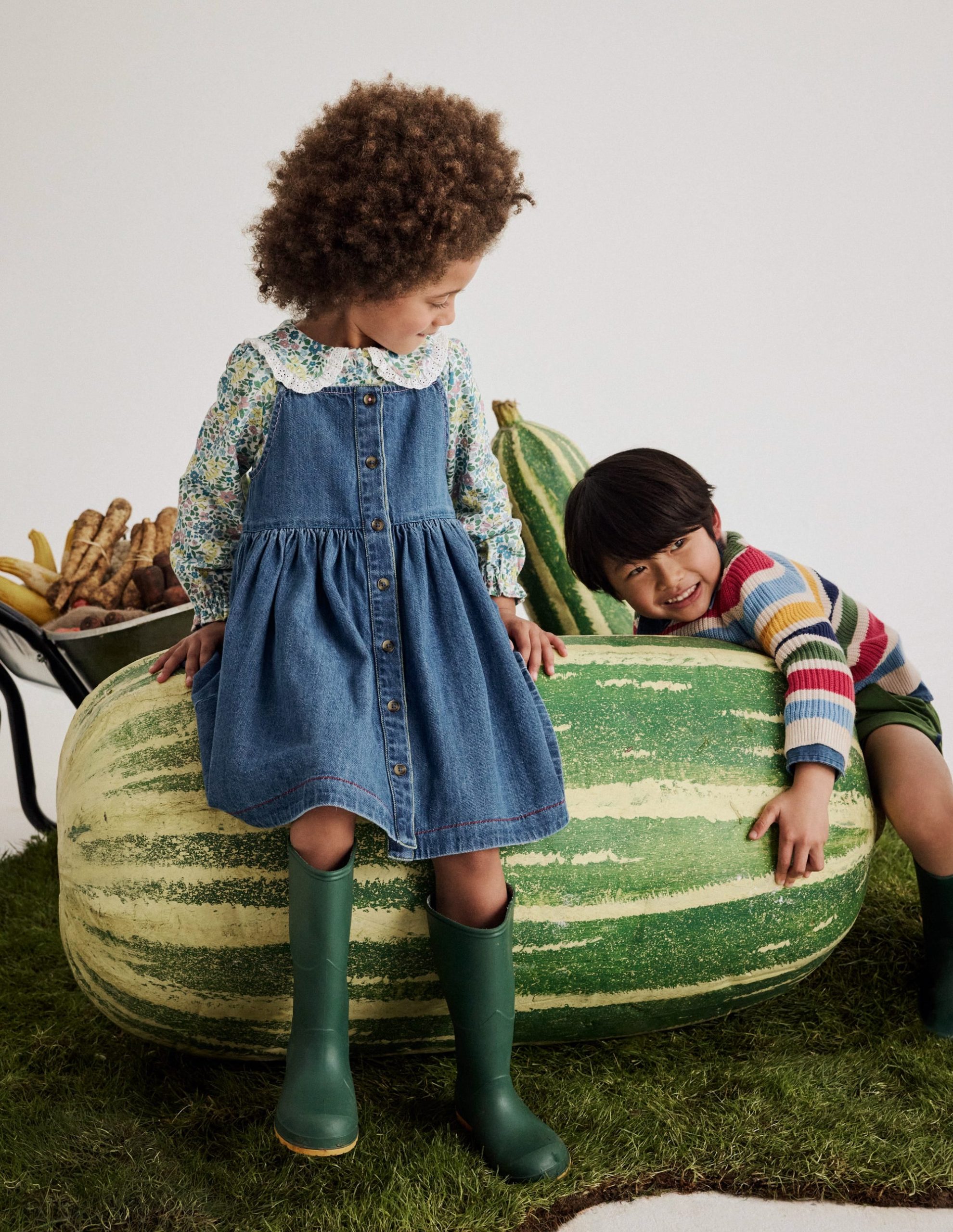 A buttoned-up pinafore made for wild adventures. Choose denim or cord and pair with a tee and drippy ice-cream. Once summer fades just swap in a collared blouse and wellies.