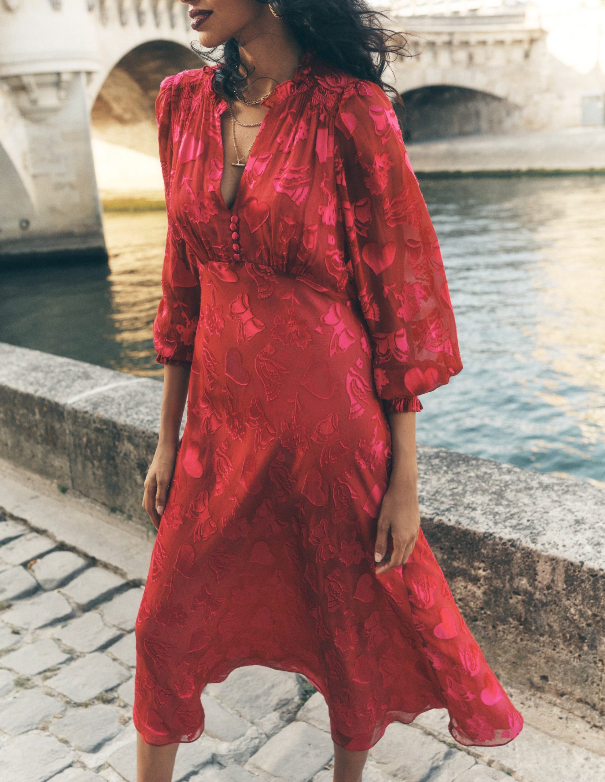Cassie has the versatile charm of a classic tea dress ??cut on the bias with a flattering midi length. The full sleeves. subtle frills and gorgeous print add plenty of modern romance. A fine choice for a winter wedding.