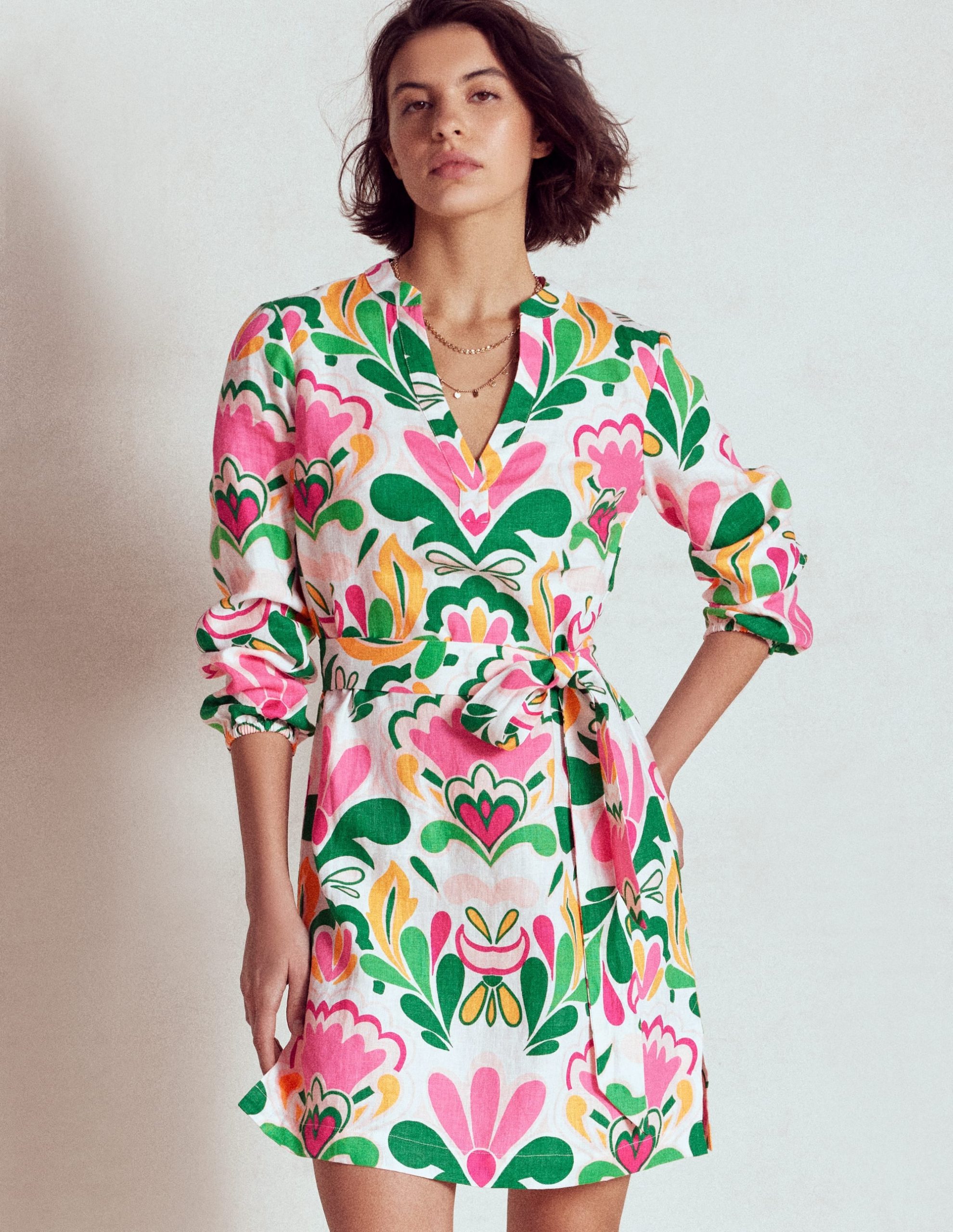 Cleo Linen Tie Waist Dress-Multi. Freesia Stamp