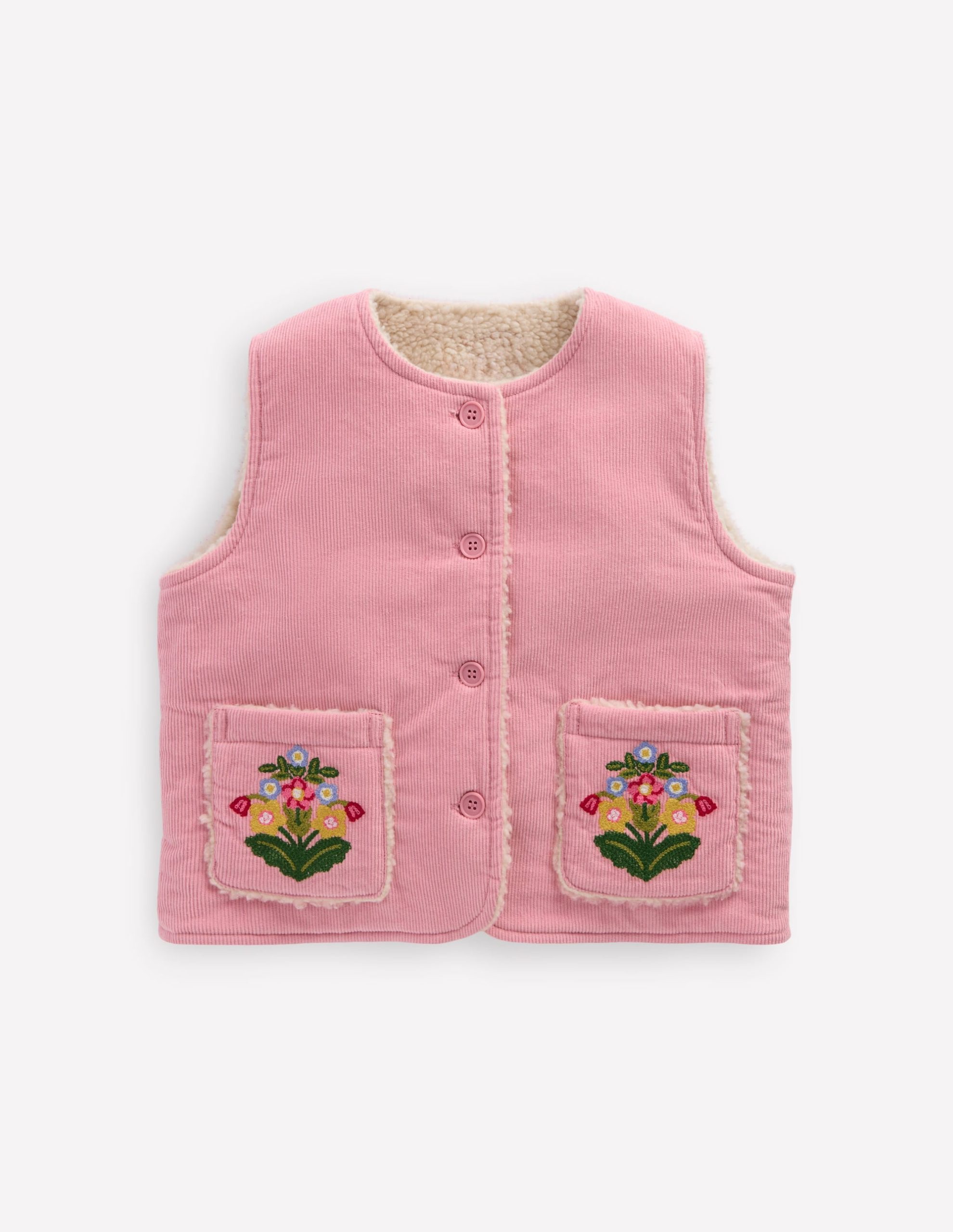 Cord + embroidery = vintage vibes. This button-up gilet is an adorable layer for cooler days with its snuggly borg lining and flower pockets.