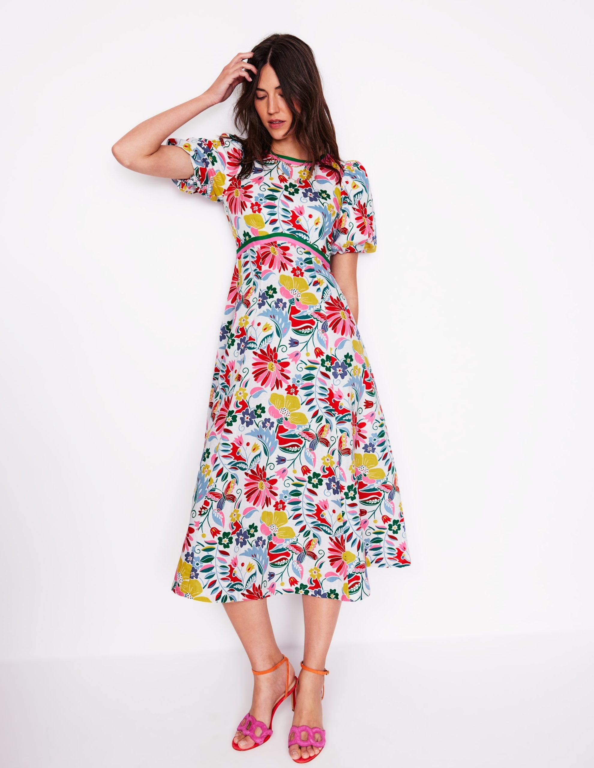 The flattering fitted waist streamlines this empire line tea dress while the puff sleeves add volume in the right places. Just add heeled sandals and plenty of summer invites.