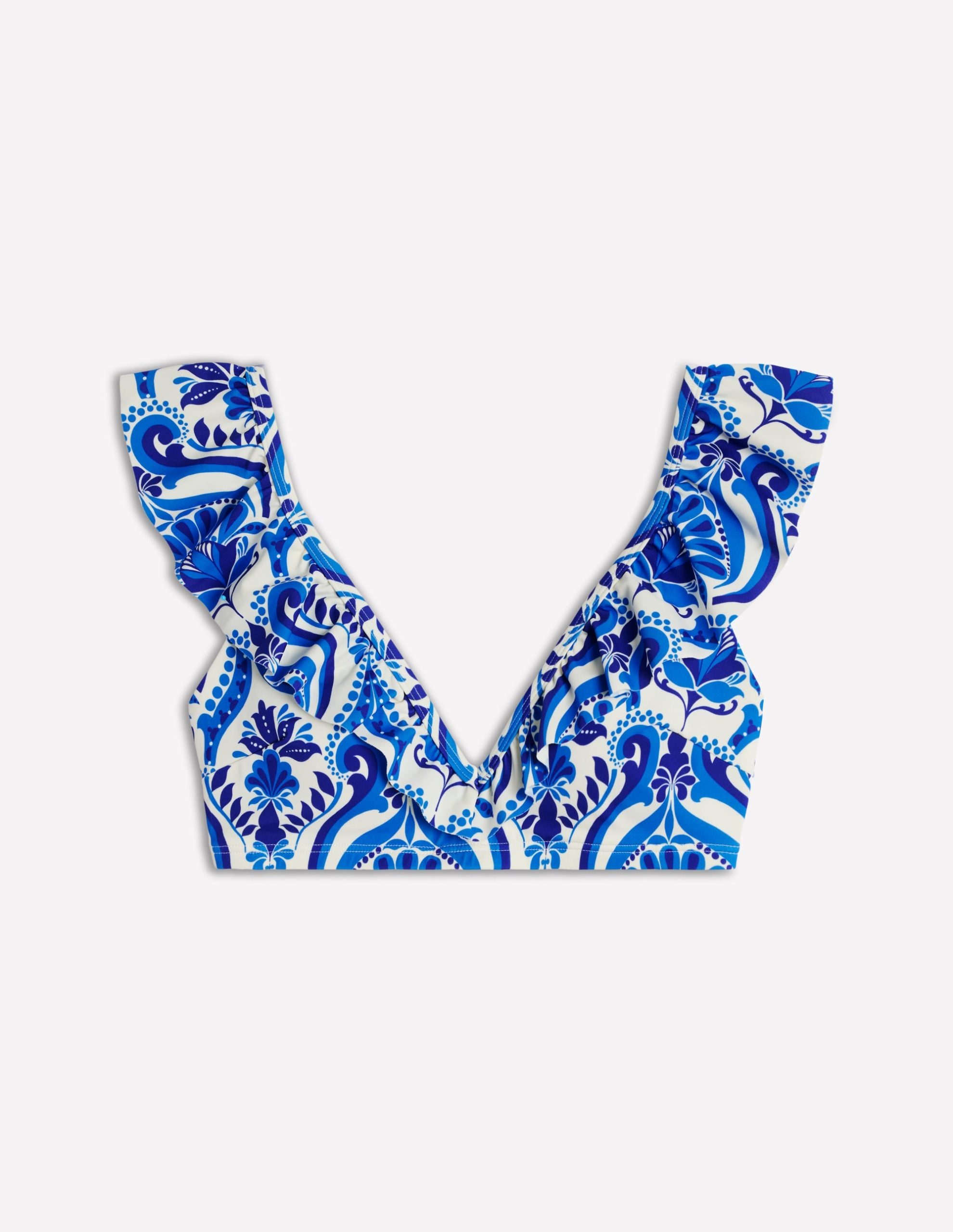 Evia Ruffle Bikini Top-Blue. Ornamental Floral