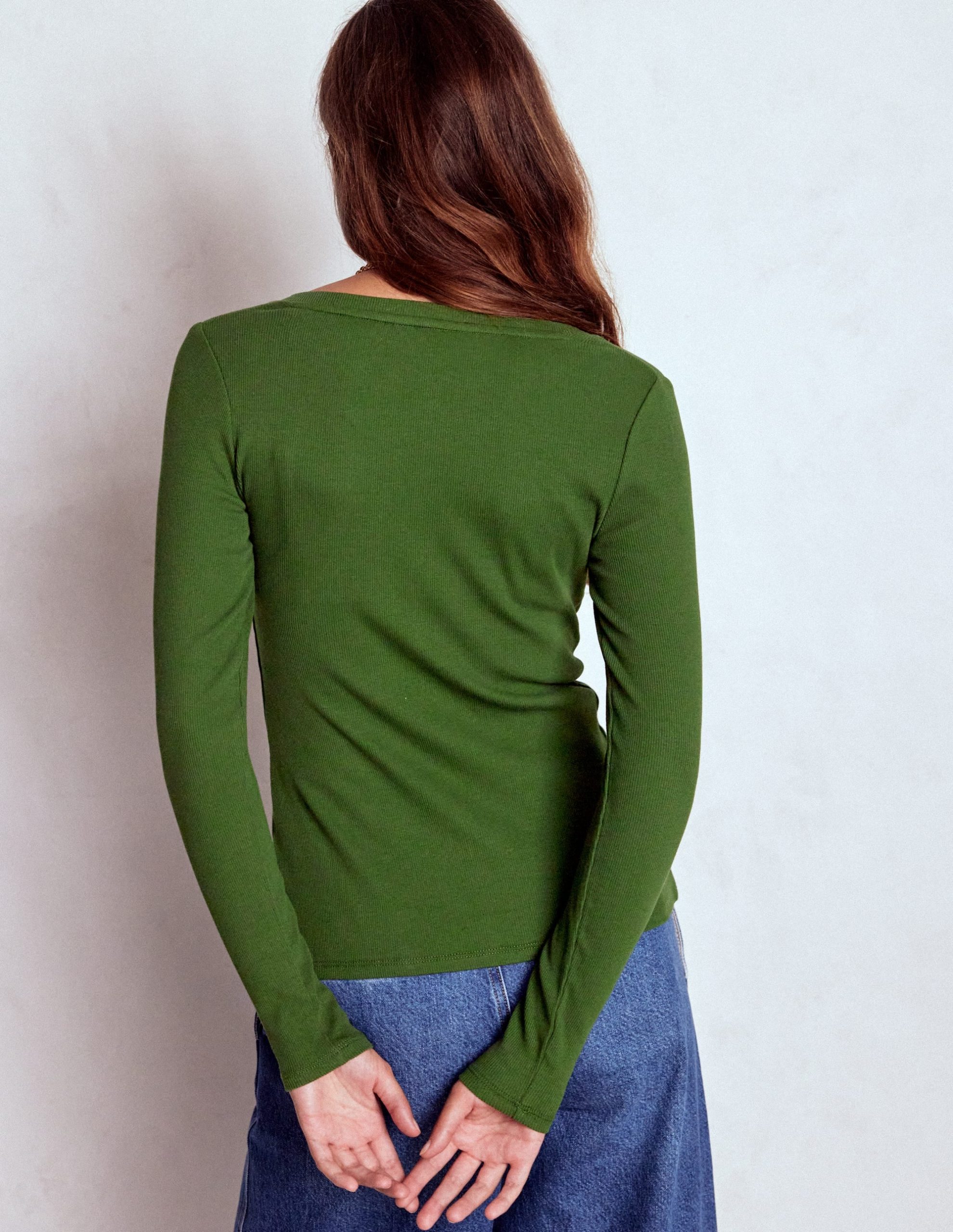 A T-shirt meets cardigan hybrid. this buttoned up ribbed top is made from cotton with a touch of stretch. A key foundational piece. it’s office. play and weekend appropriate and about to become one of the hardest working items in your wardrobe.