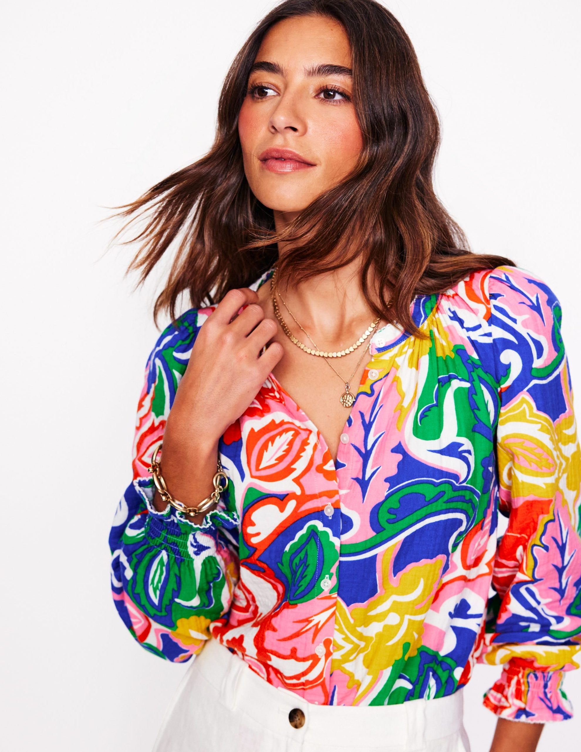 Jeans. trousers. skirts. shorts or even swimwear. there’s nothing our Evie top won’t go with. It’s made from two layers of crinkled cotton and shaped with blousy sleeves and a buttoned front.