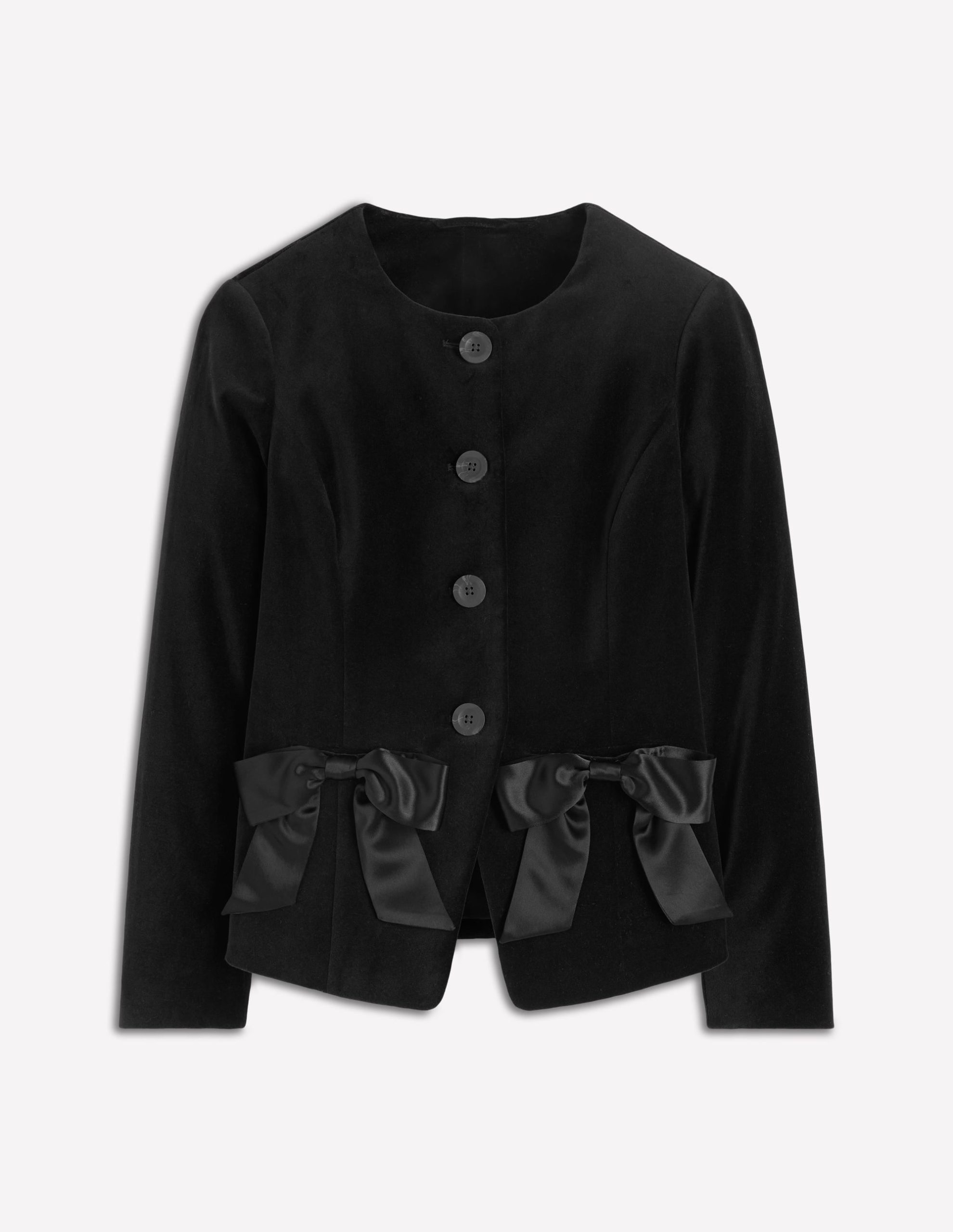 The fabric of right now? Velvet. The finishing touch we all want? Bows. Pulling both together into a tailored blazer? One stylish bow-nanza. This versatile party season hero makes us feel like all our Christmases have come at once.