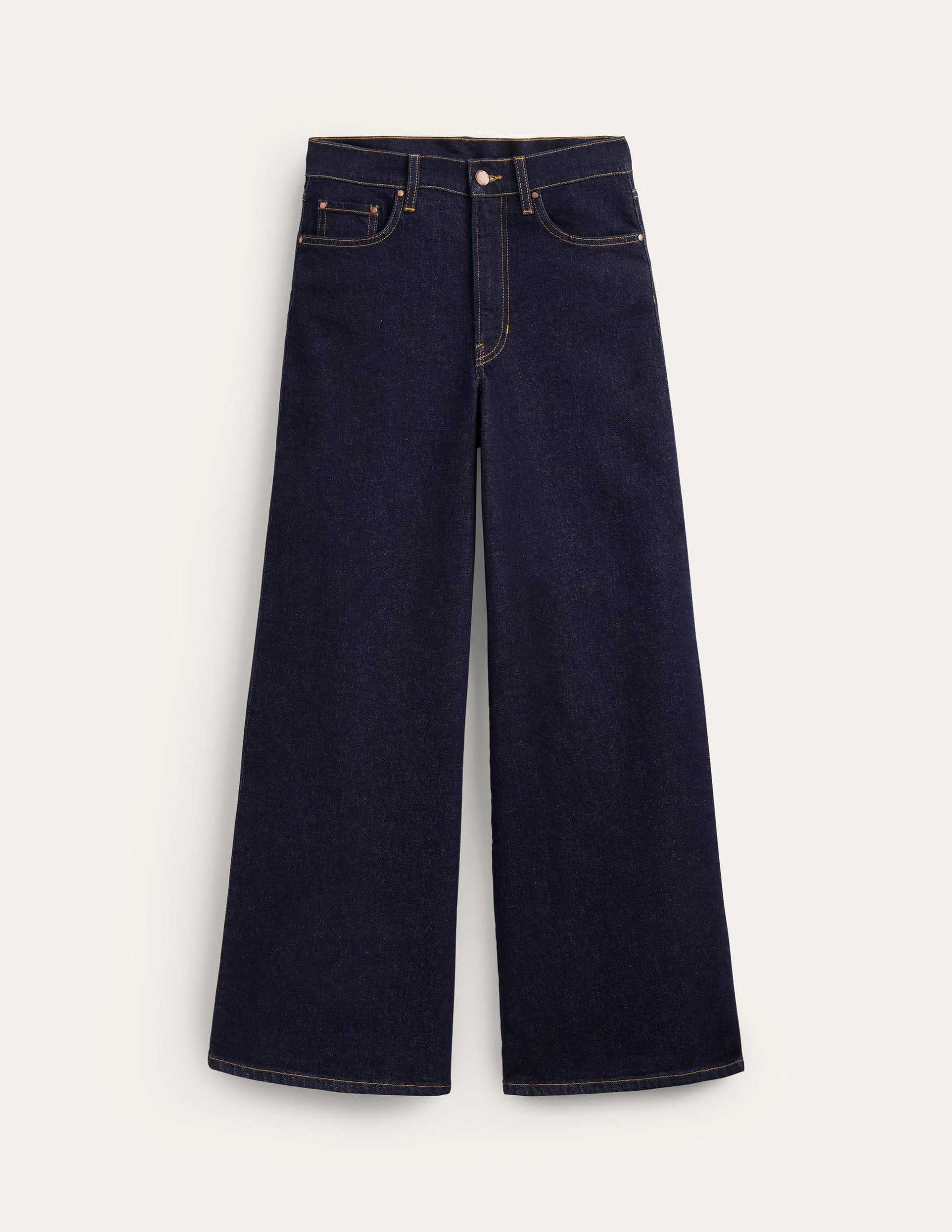 Woven with just the right amount of stretch. these high-rise. wide-leg jeans have a relaxed feel ?C the added ease means a little more room to move. For a more fitted look. we recommend sizing down.