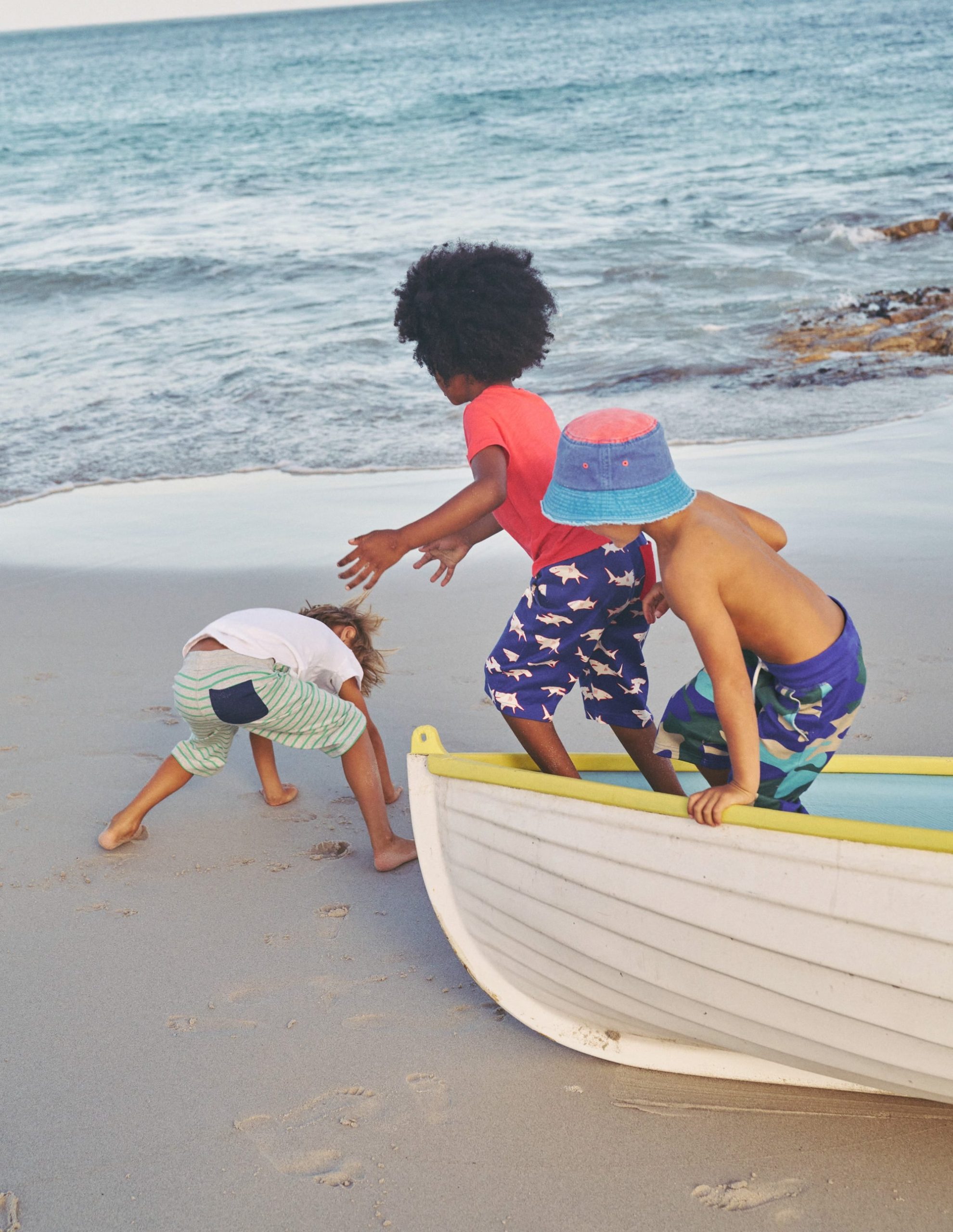 Bullseye. Super comfortable and easy to wear. our essential jersey shorts in hardwearing striped cotton. are right on target this season. These long jersey shorts also feature a patch pocket on the back in a contrasting colour.
