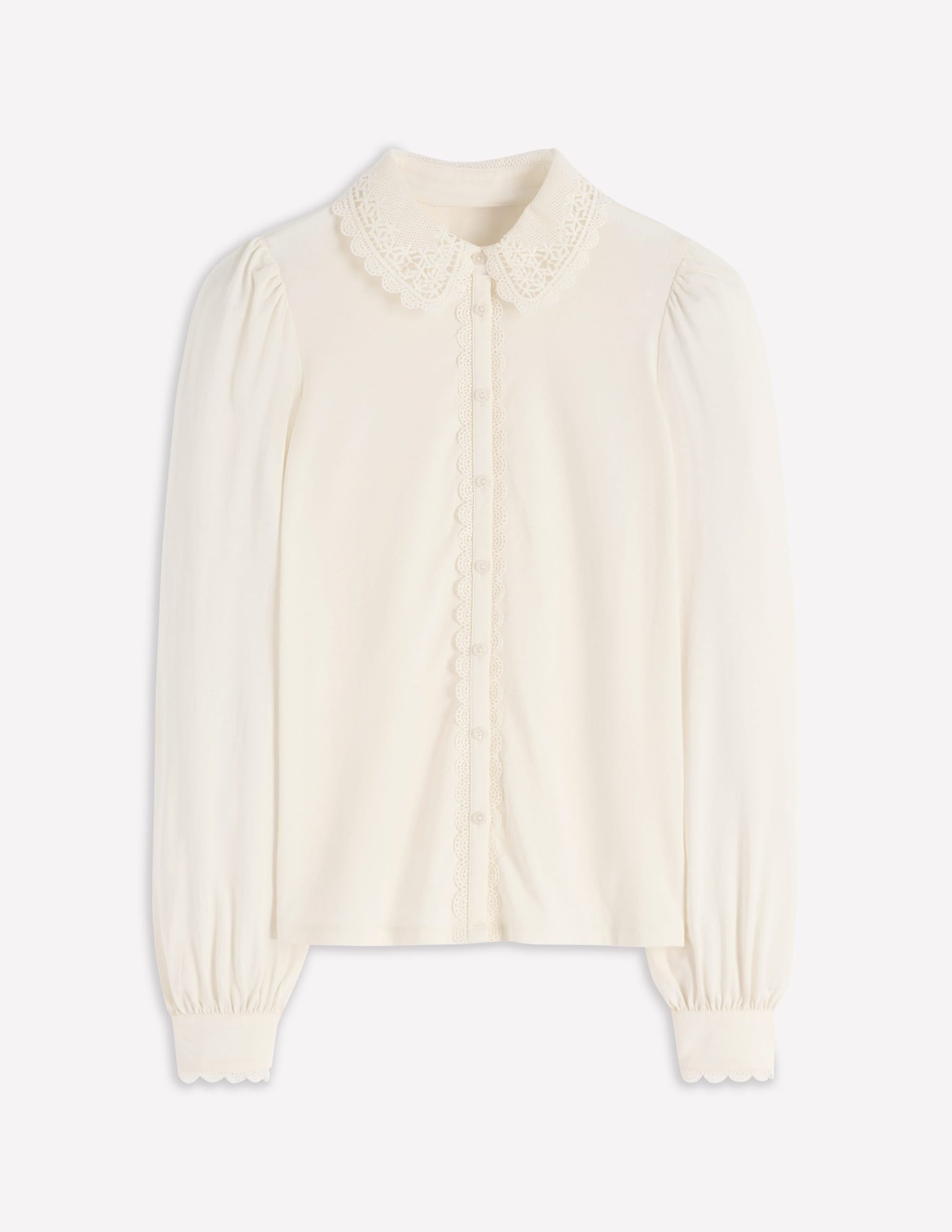 If we can draw your attention away from that incredible lace collar for a second. we’d just like to point out that this blouse is made from a silky soft and seriously comfortable cotton-blend jersey.