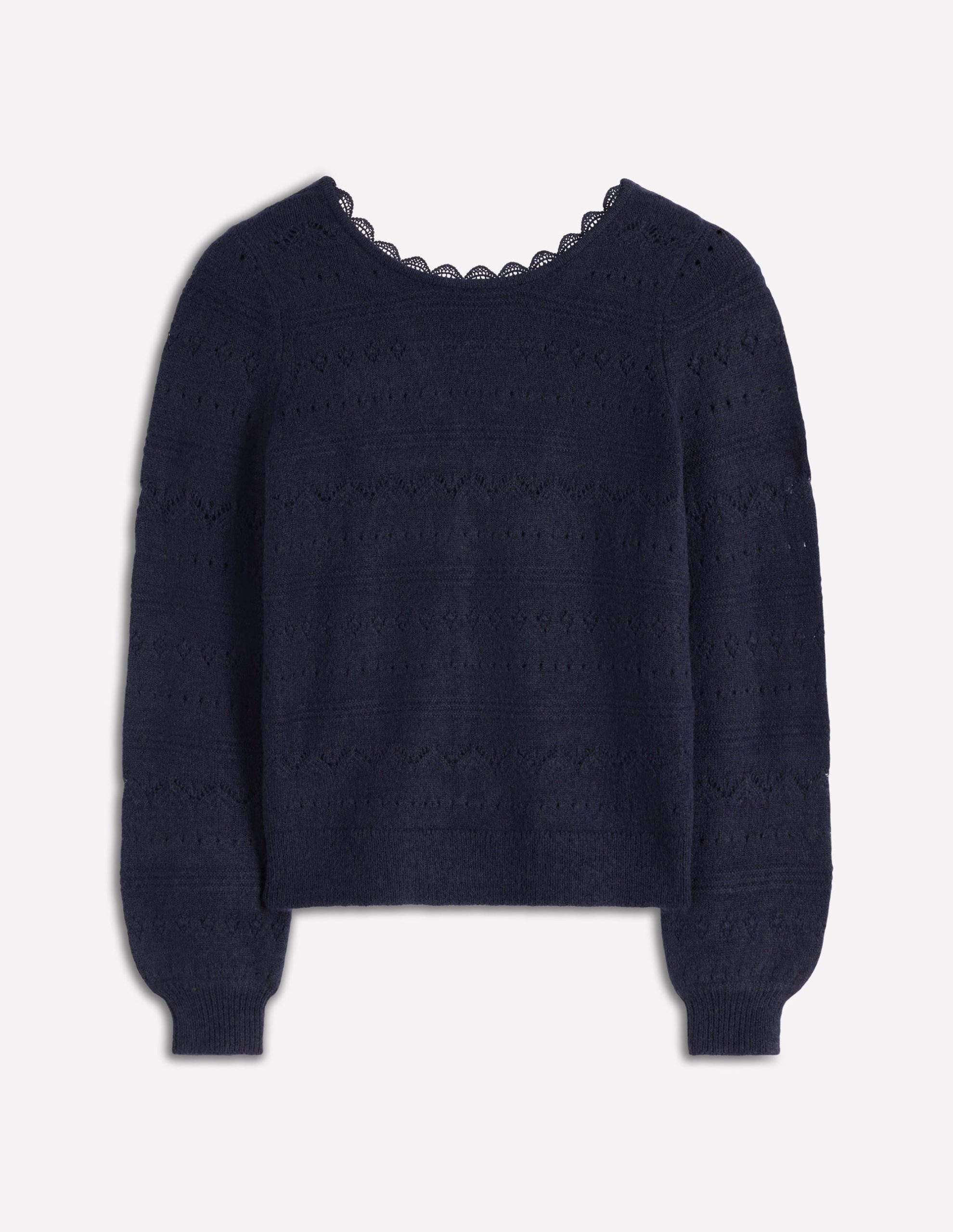With intricate stitch patterns and lace trim. this is the kind of jumper that makes you look forward to cooler weather. And that’s before you even see the back. Surprise!