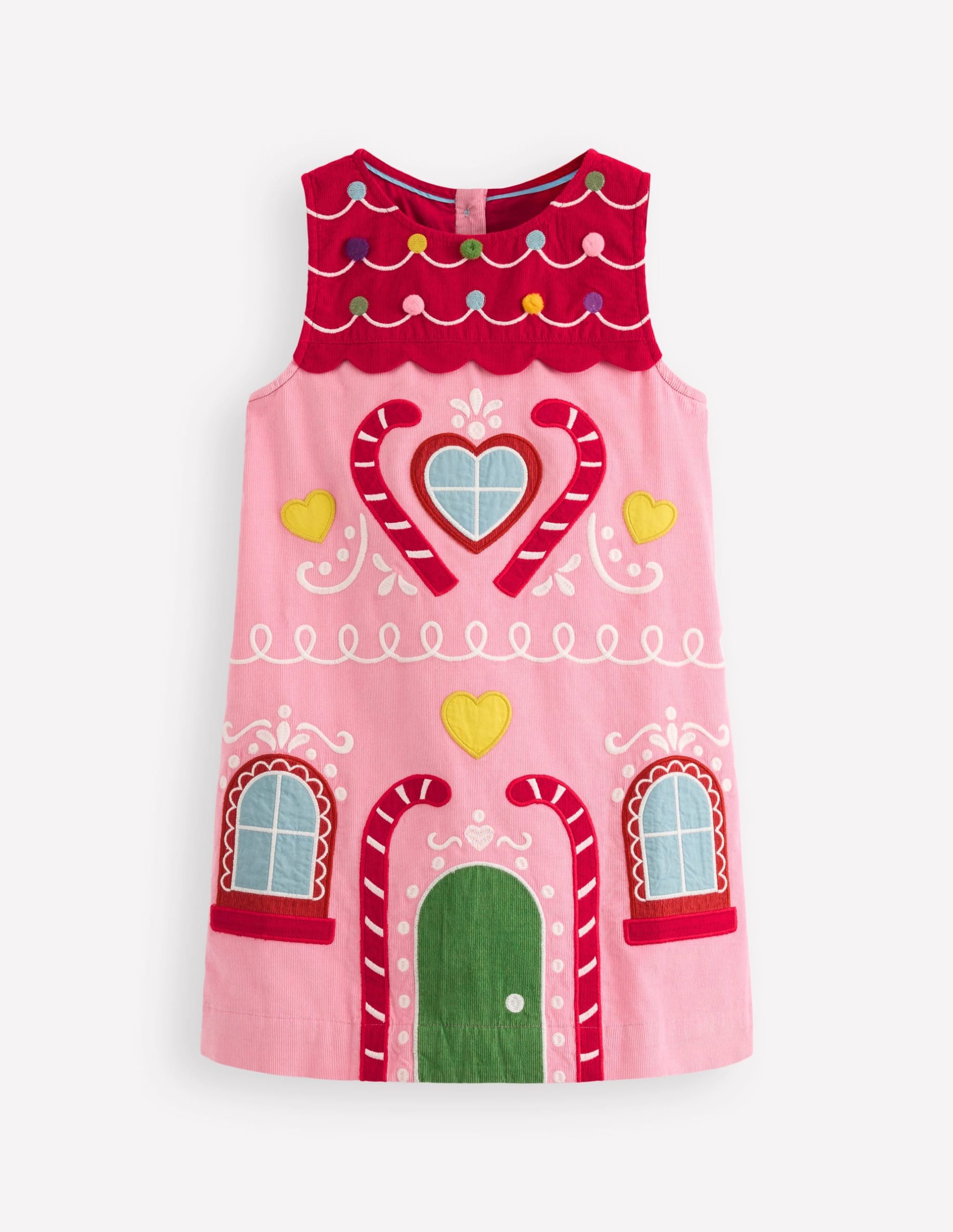 A gingerbread house in dress form that looks good enough to eat? Cue Mini excitement. This embroidered style is spun from pure cotton. machine washable and has pockets. So a thumbs up for parents too.