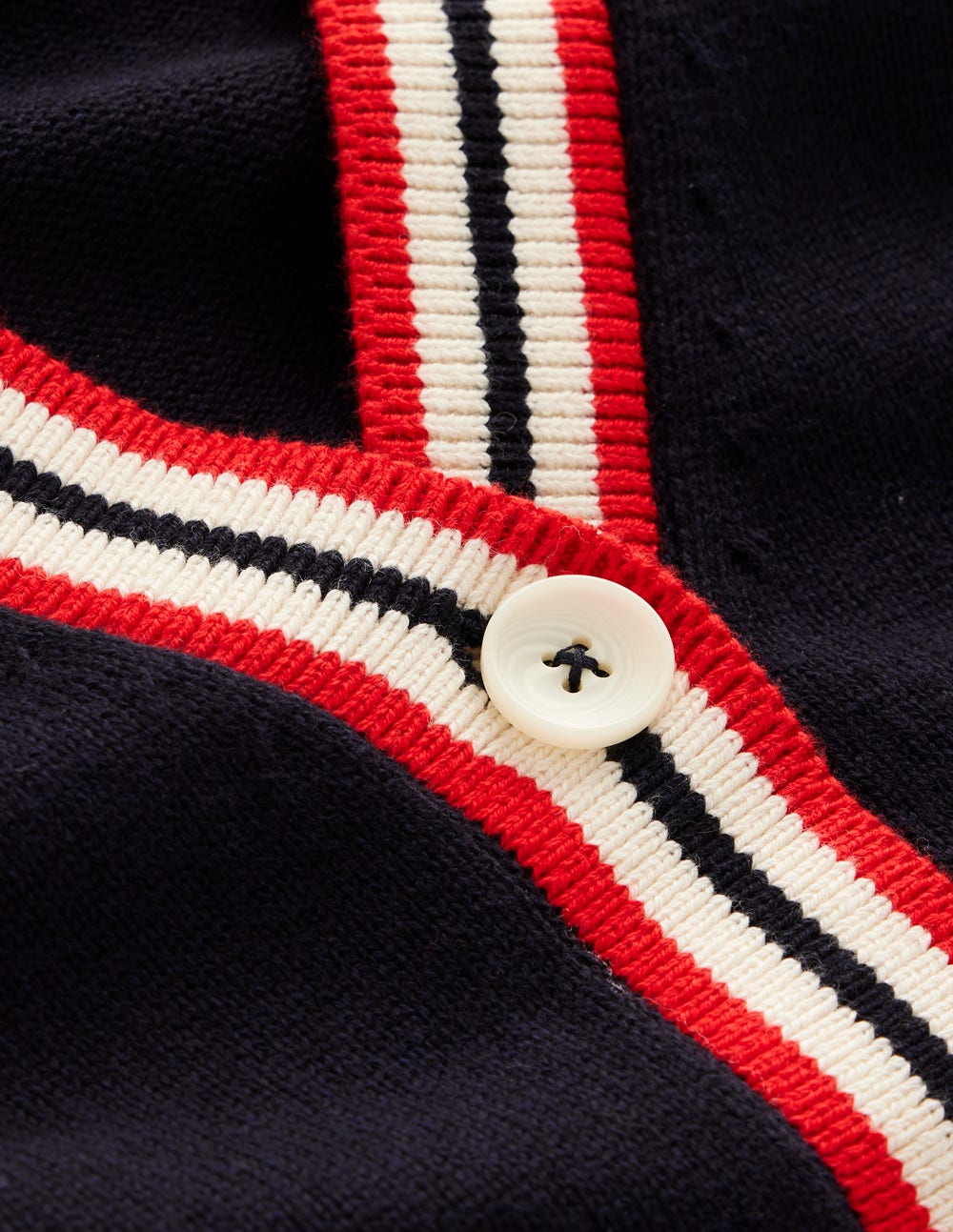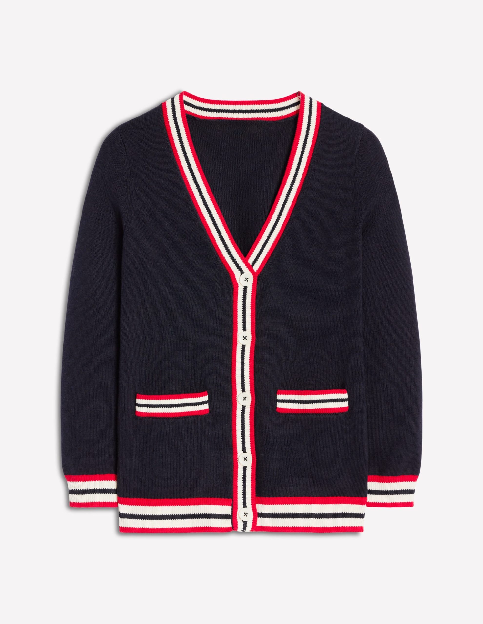 Our signature stripes give this longline cardigan a fresh Varsity vibe. Spun from a blend of cotton and wool it’s a cosy layer that goes with everything and will span the seasons.