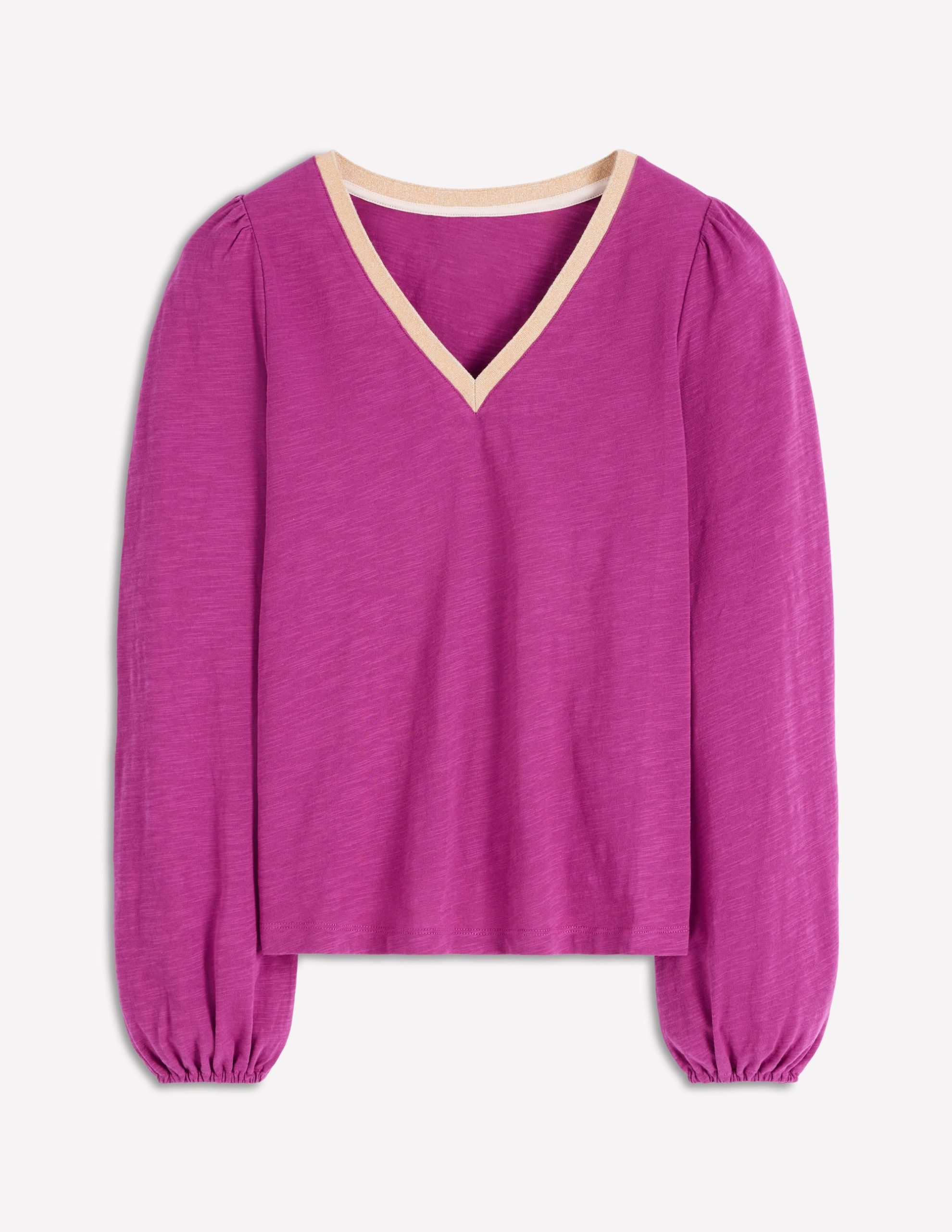 How to elevate a basic cotton top into something really special? We’ve added fuller sleeves and a V-neck with metallic gold trim. Wear now with jeans as a weekend pub top or layer under a jacket into autumn.