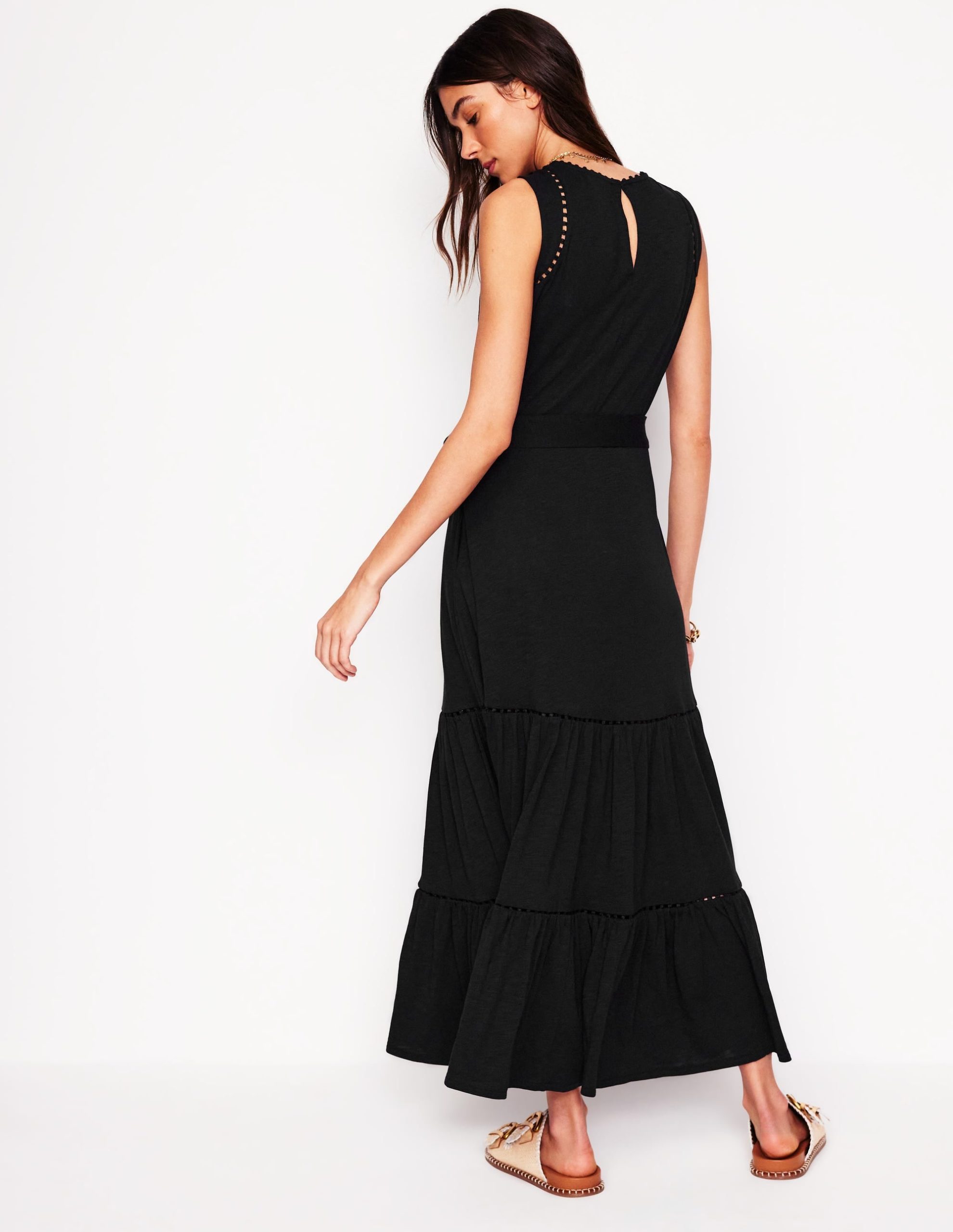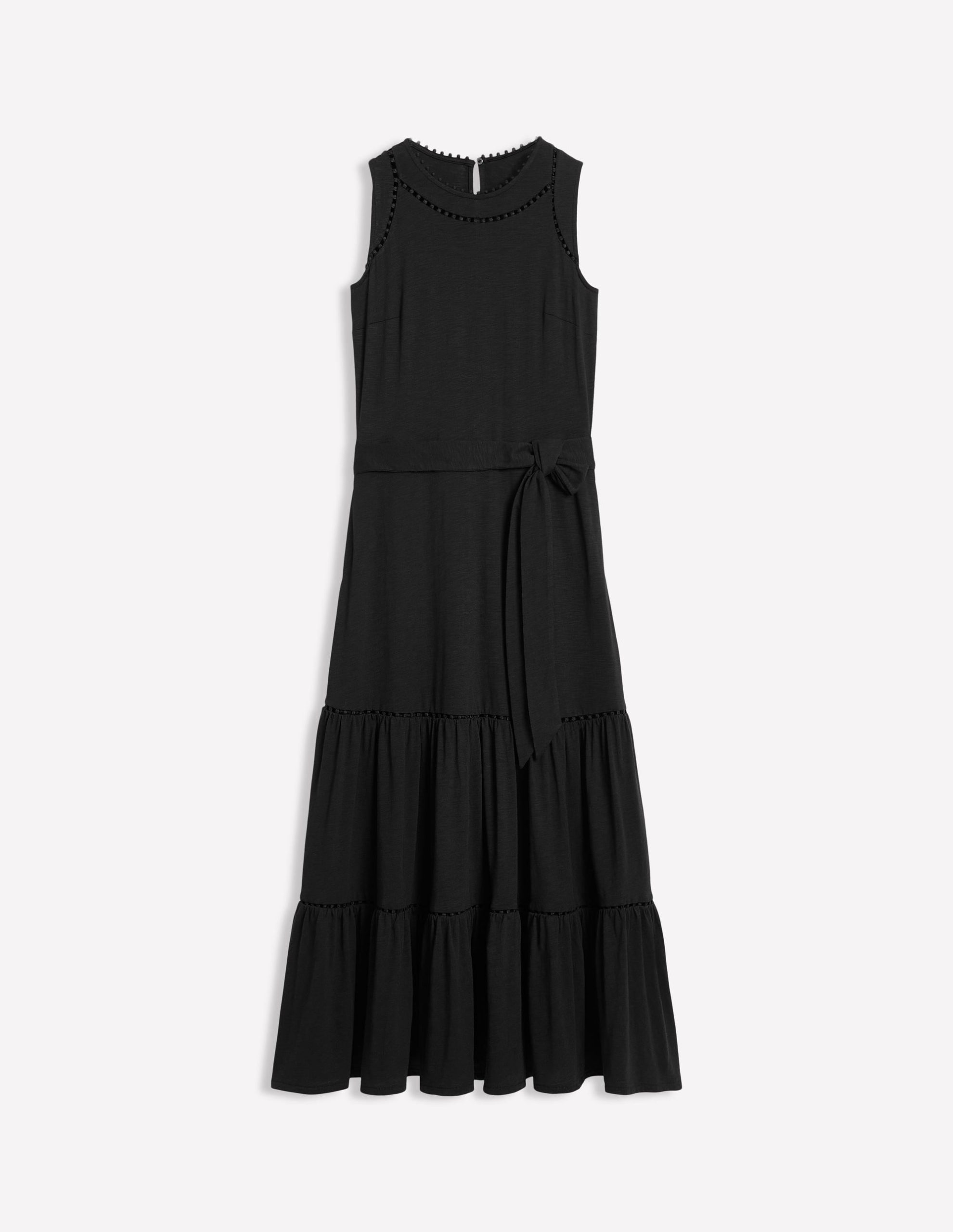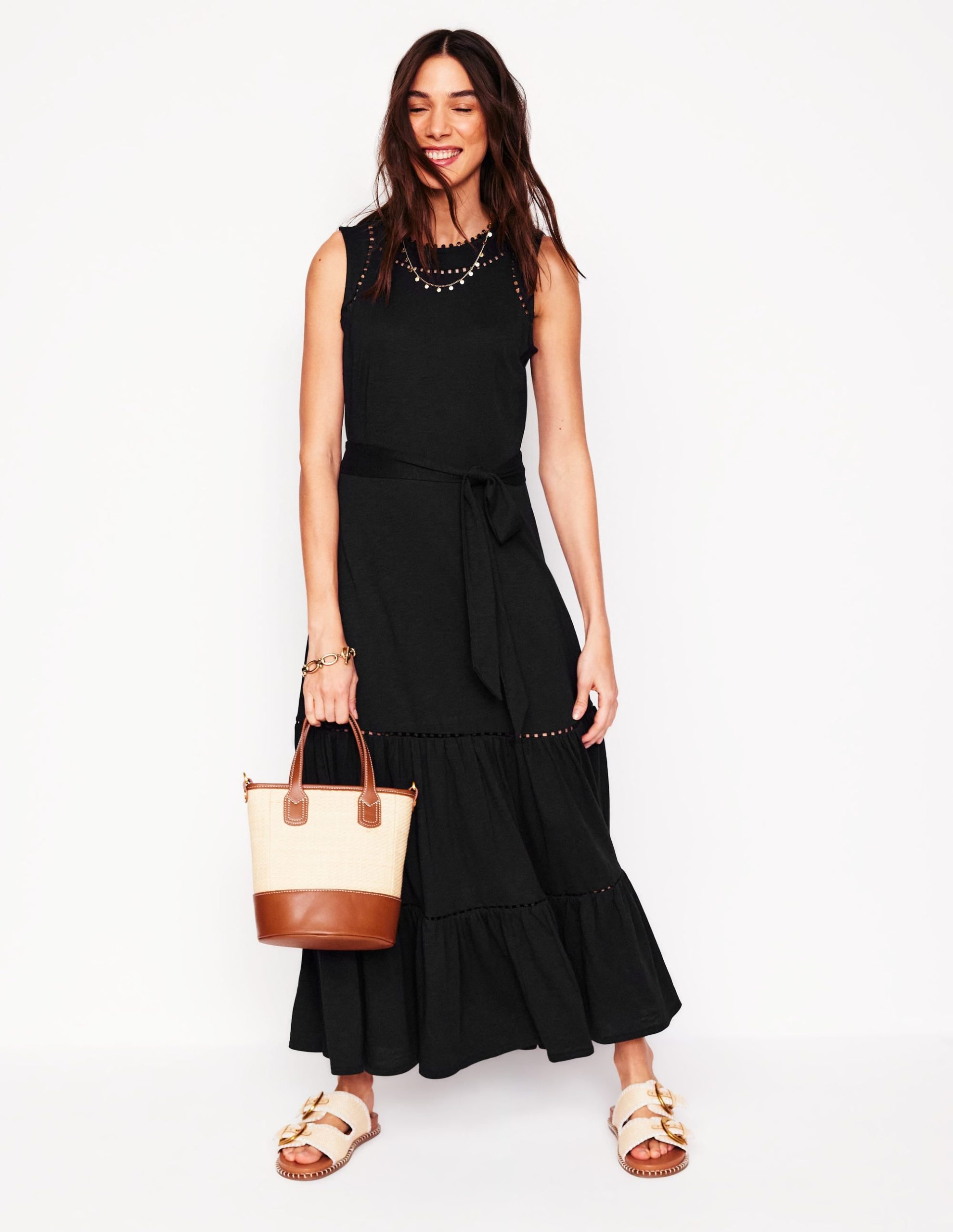 Our sleeveless Mila dress is all about the details (pom-pom trim to be precise). It also has a tiered maxi-length skirt and a waist-defining belt.