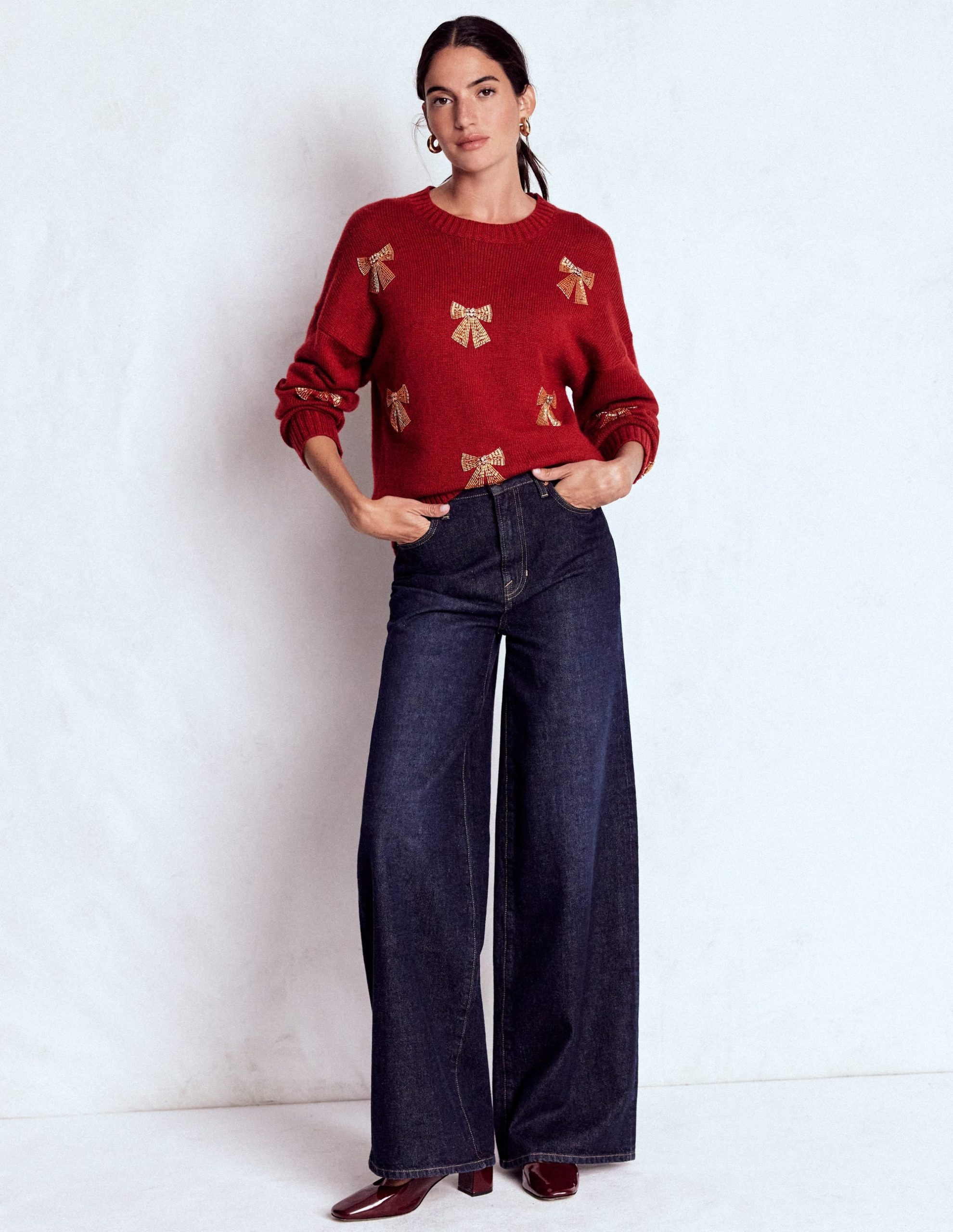 Natalie Embroidered Sweater-Red. Embellished Bows