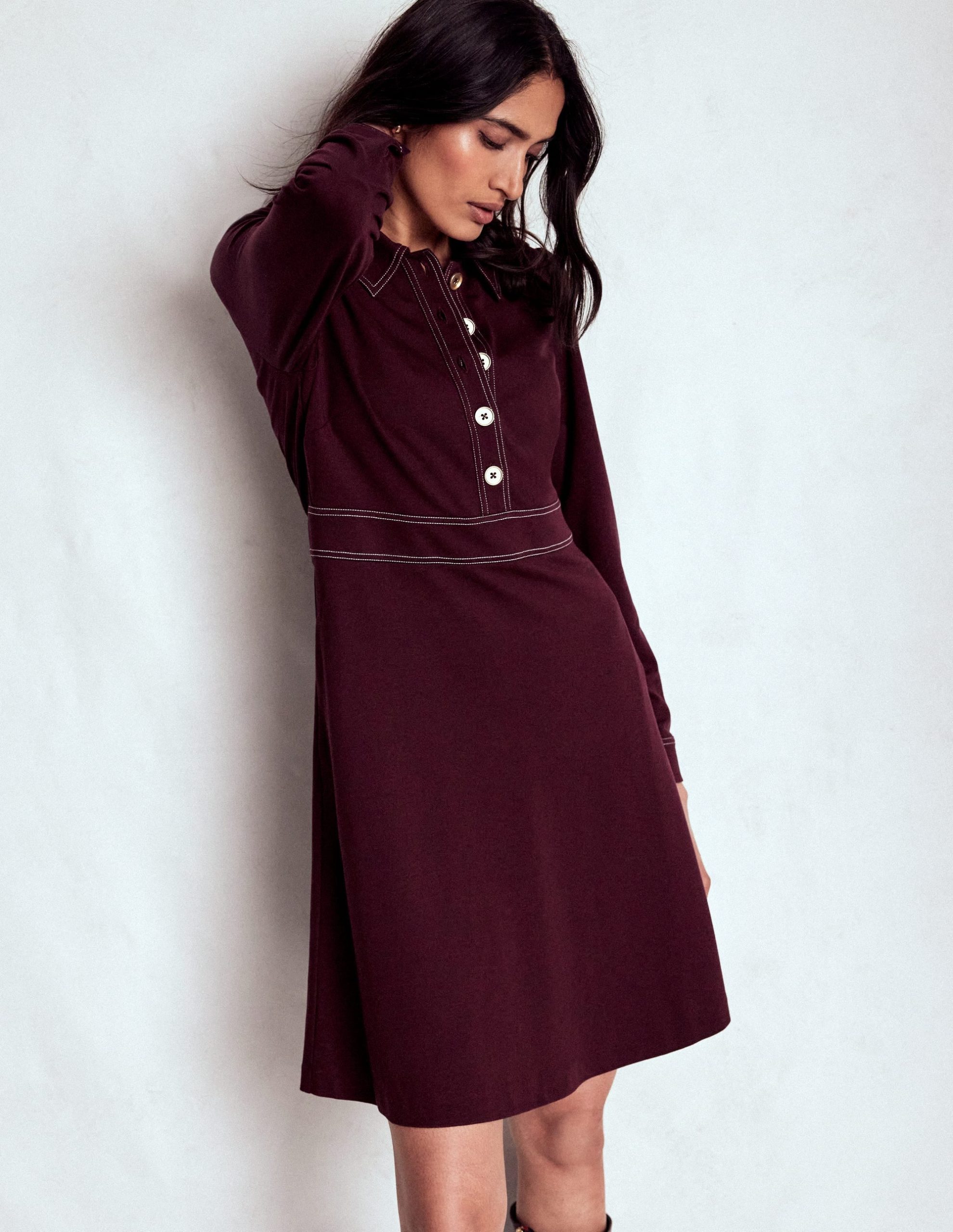 Comfortable and crease-free. we’ve updated our Nicolette ponte short dress with long sleeves for colder days. The shiny buttons. elegant stitching and classic colours give it desk-to-dinner powers. It’s marvelous in a swishy effortless way.