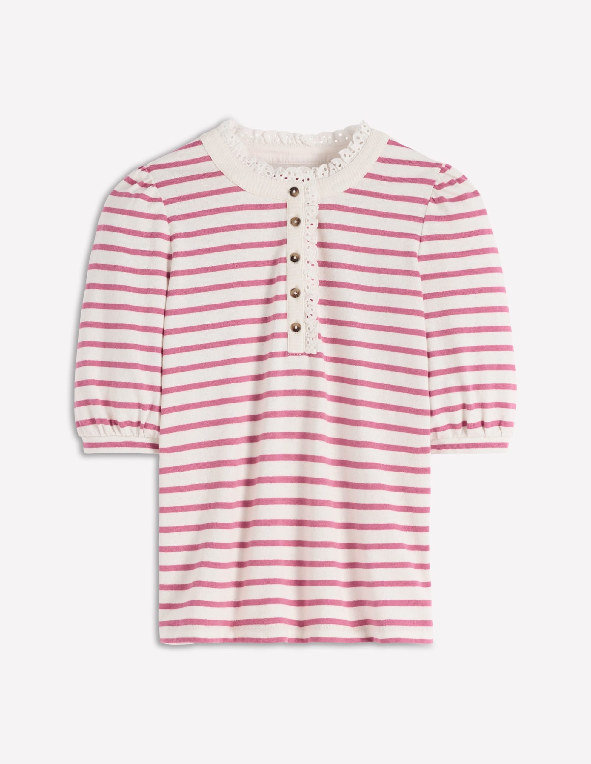 We’ve given the classic button-up Henley an upgrade with lace trim and puff sleeves. Still comfortable enough for every day. just that little bit more elevated.