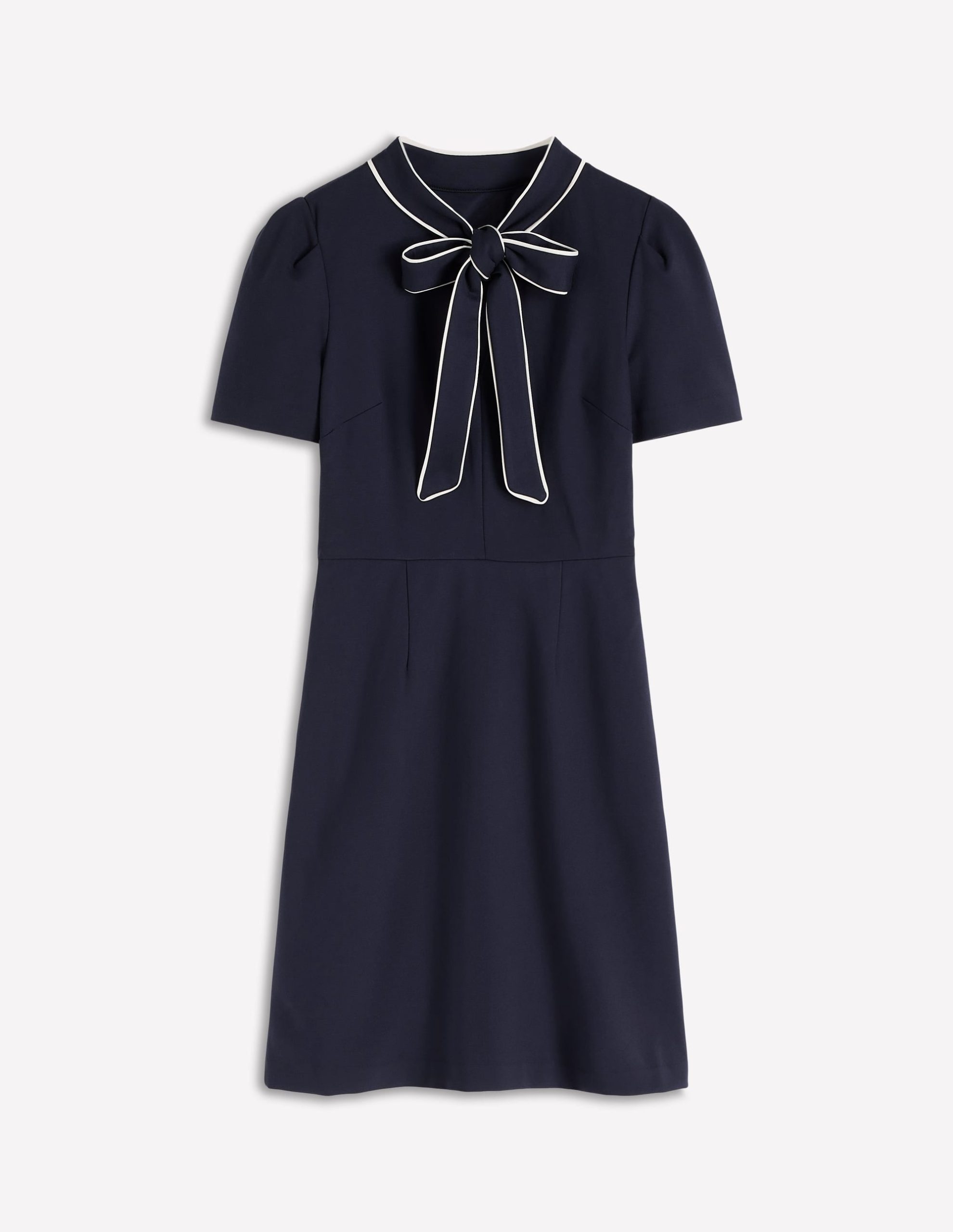 For a smart look. you can’t go wrong with a pussy bow. This comfortable jersey dress has darts for a fitted silhouette and gently puffed sleeves. Pop it down as another win for the work wardrobe.