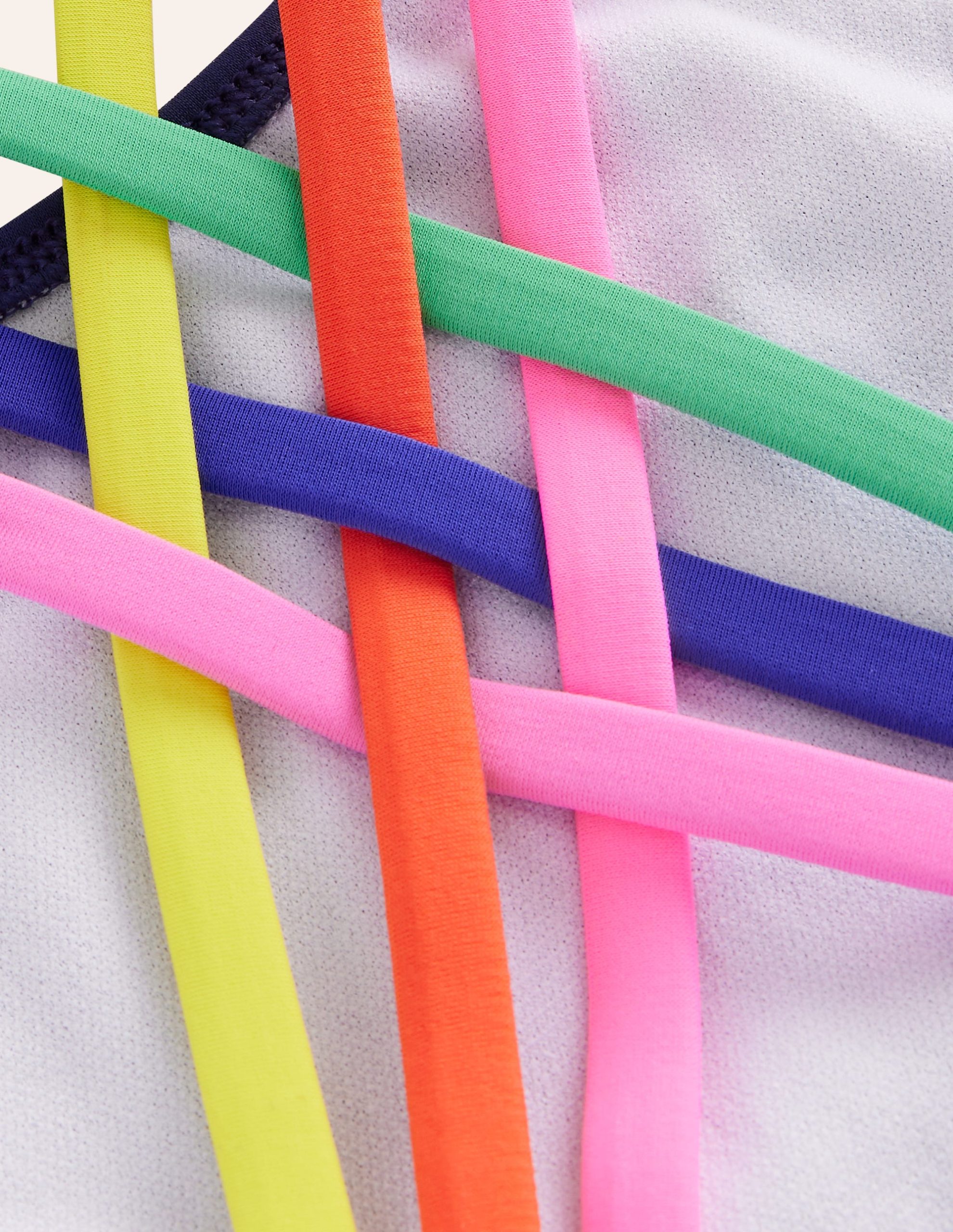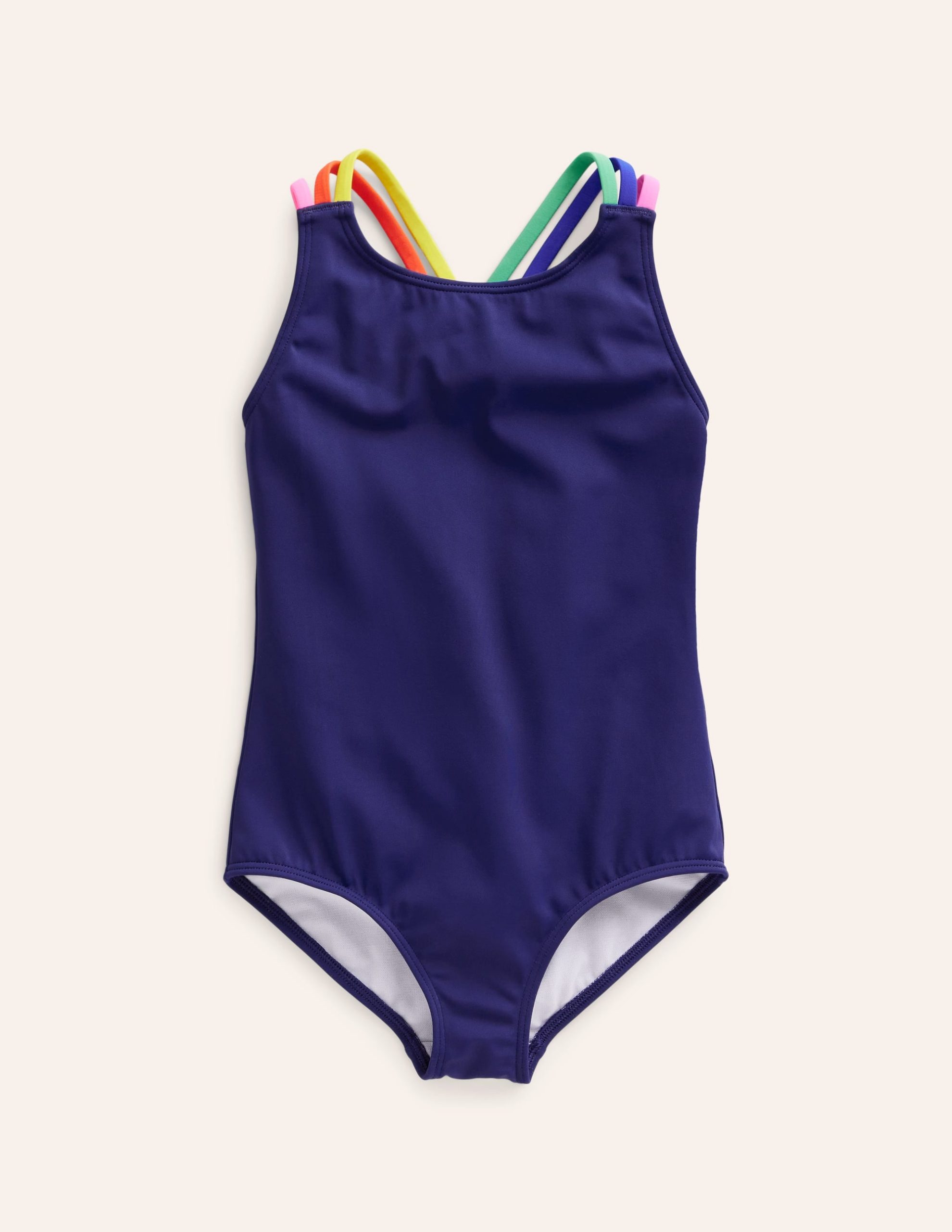 We’ve enlivened this classic round neck swimsuit with vibrant rainbow cross back straps. Perfect for paddling pool hangouts.