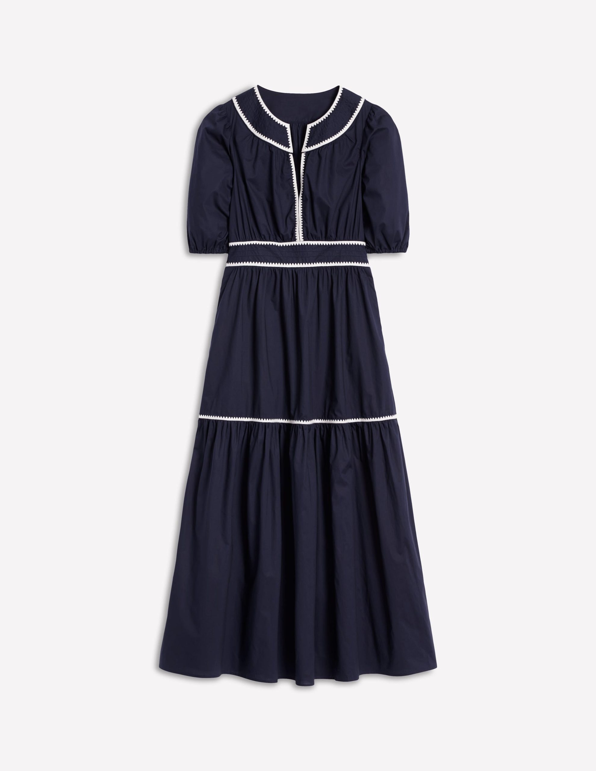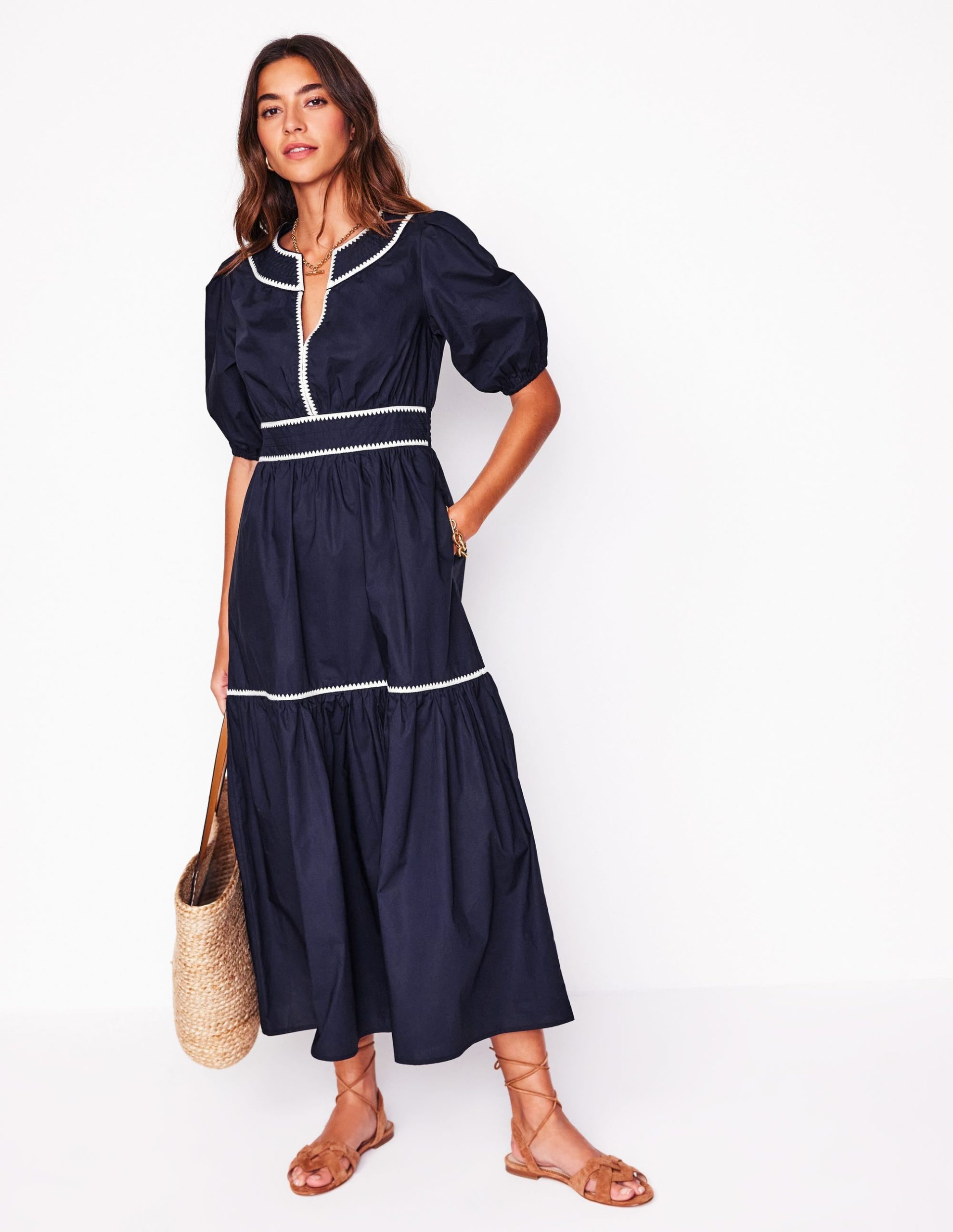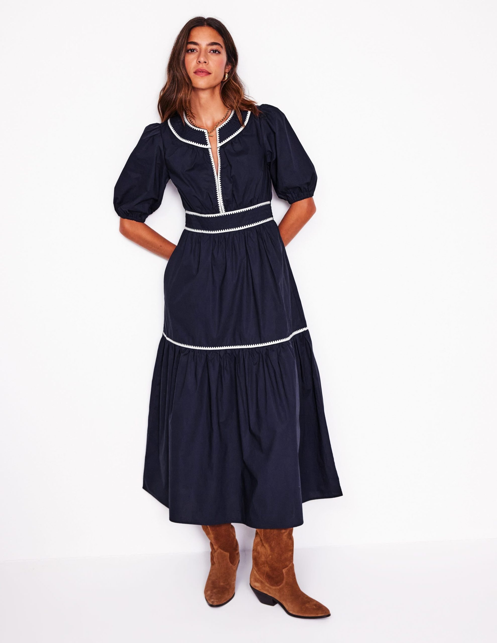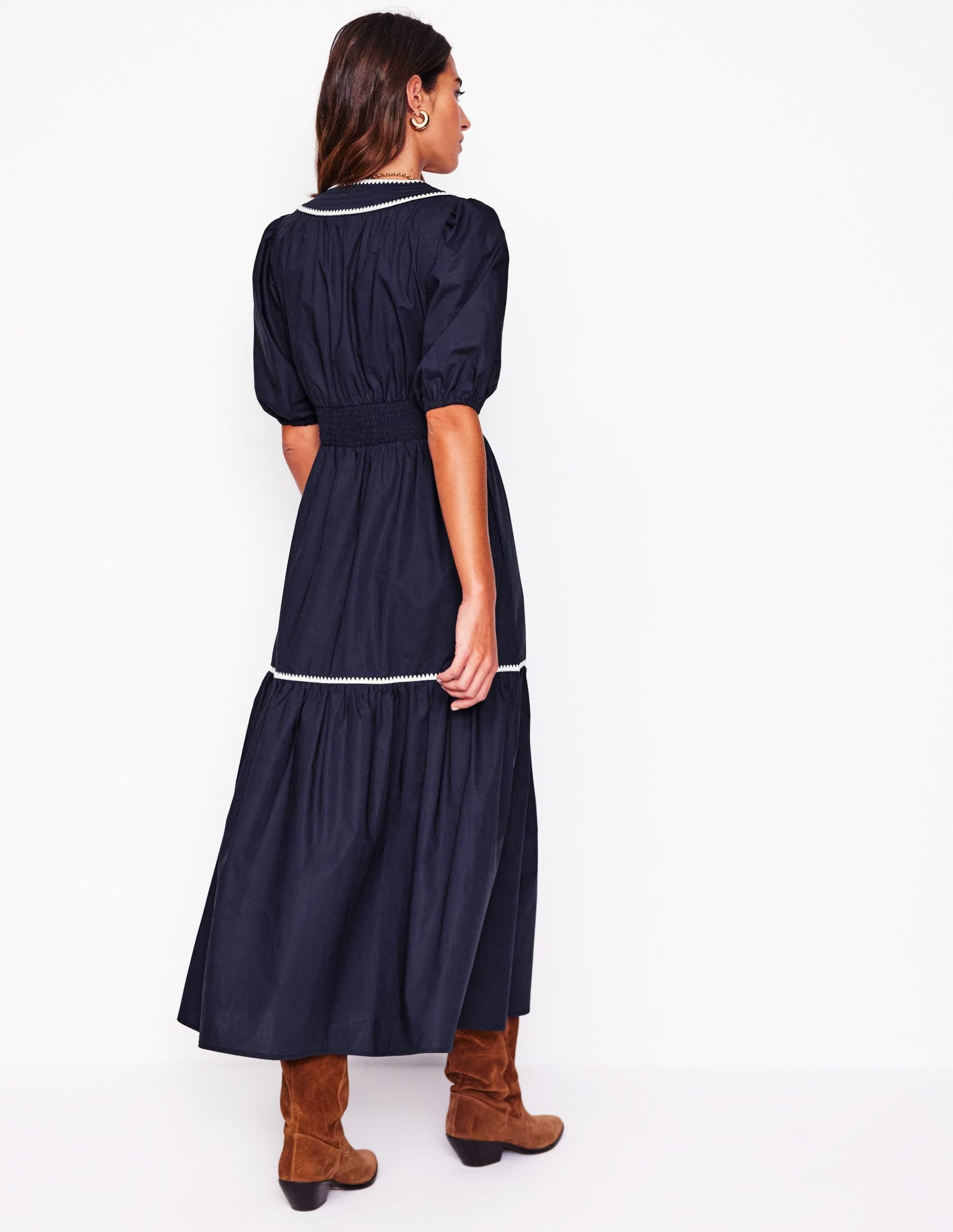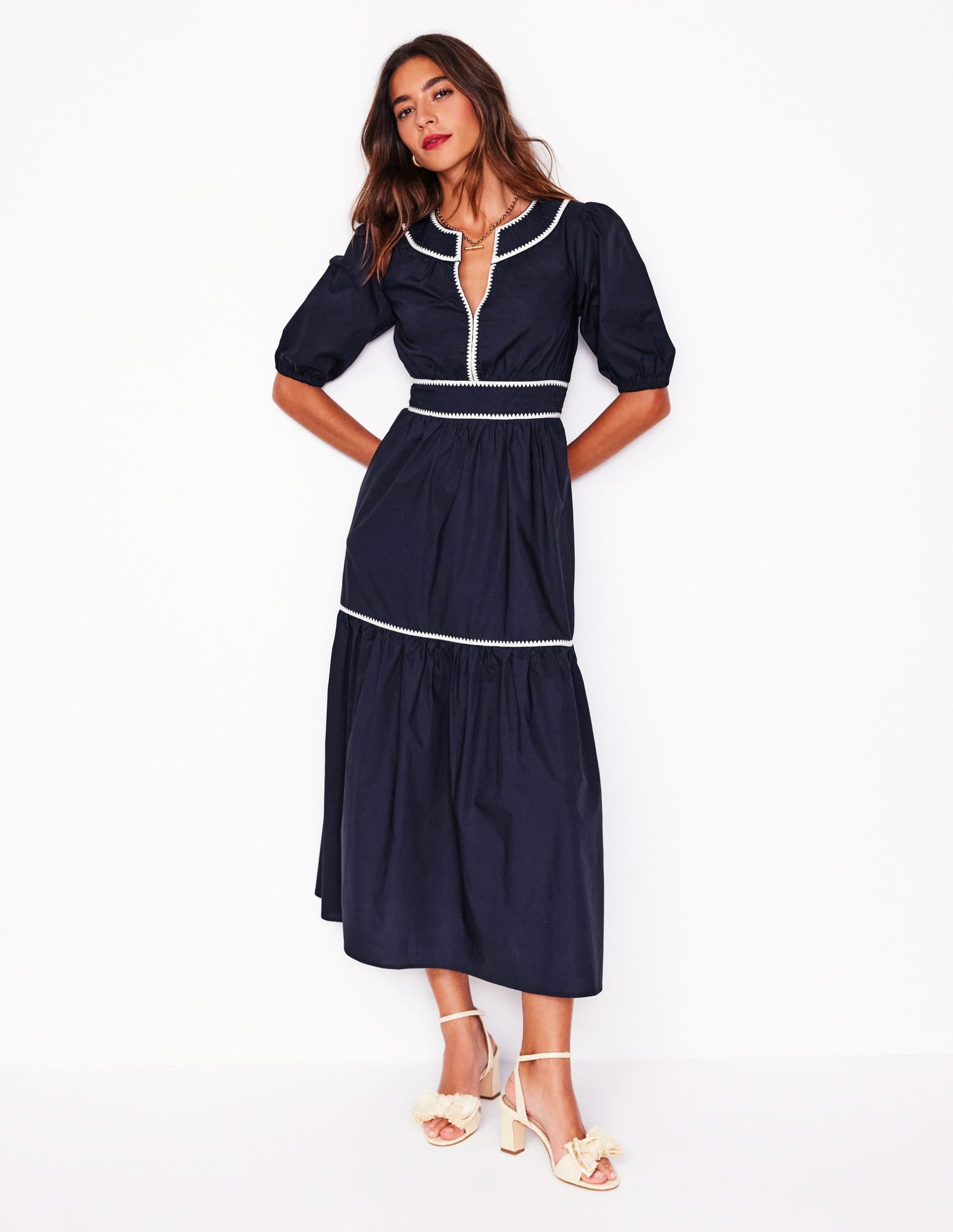 We can’t get enough of tiered midi dresses. Which is why we dreamt up the Rhea with its embroidered blanket stitch trim at the collar and neckline for a final flourish.