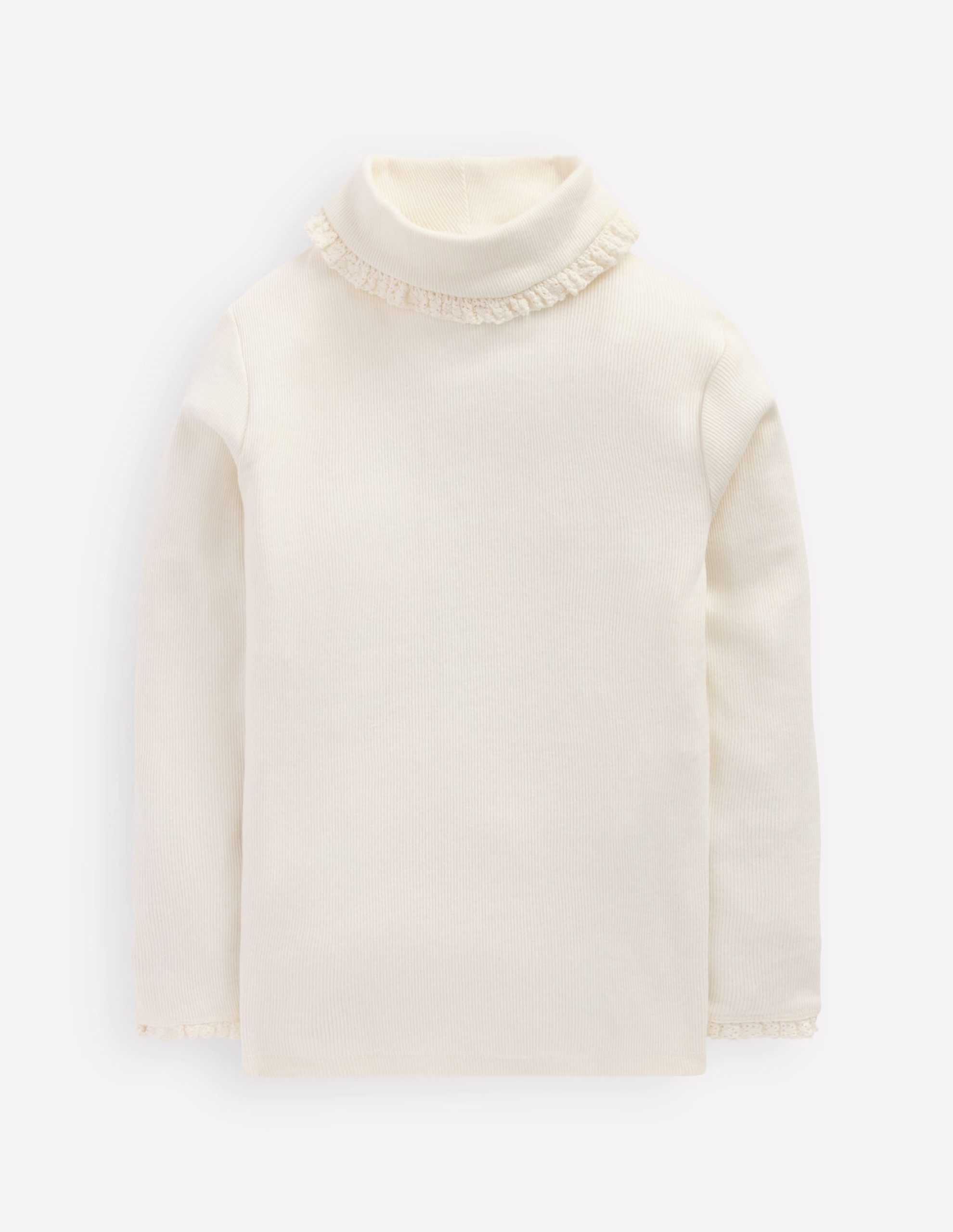 This cotton-rich long-sleeve top is perfect with dungarees or under a jumper to show off the frilled roll neck. Choose from prints and colours. including neutrals and brights.