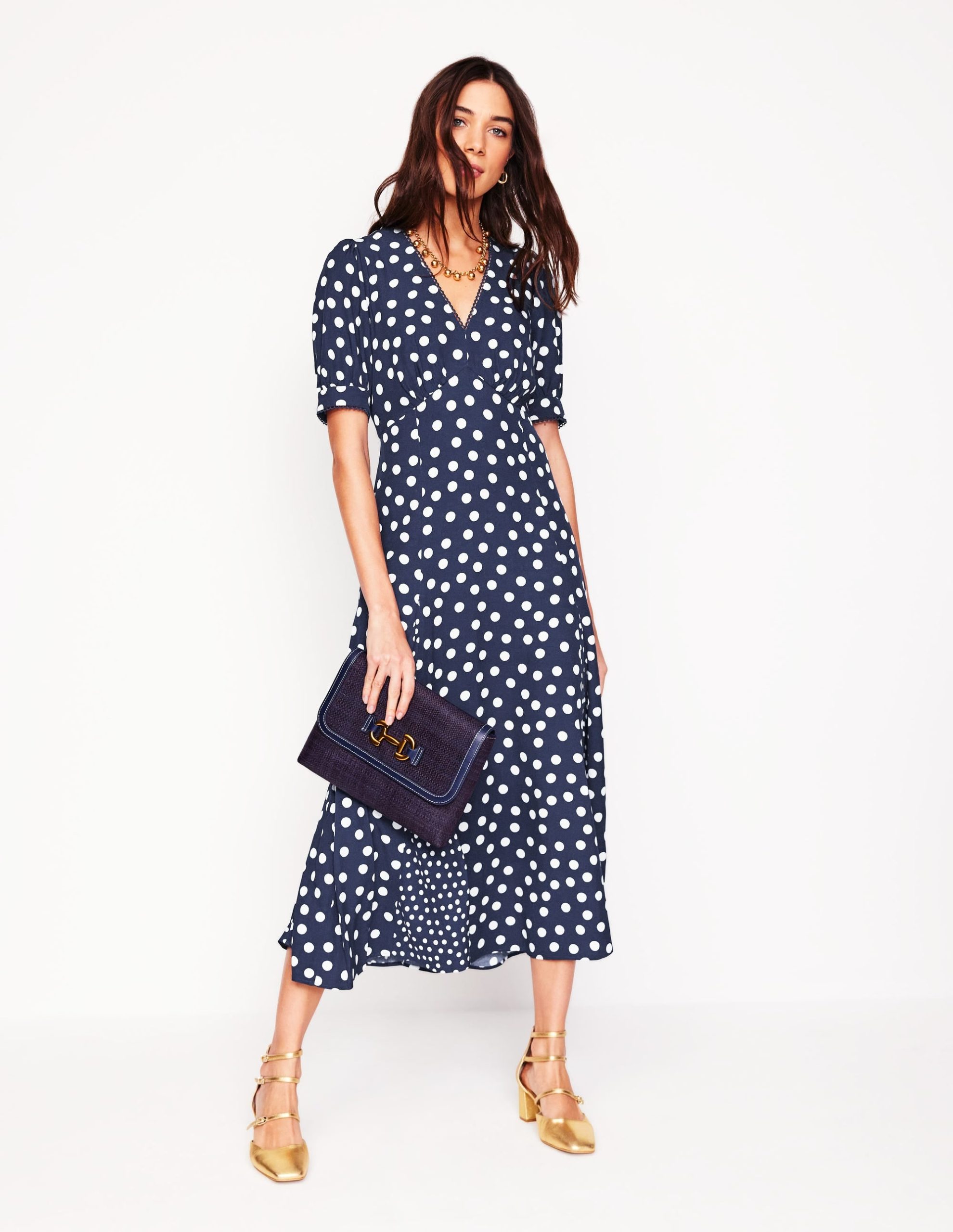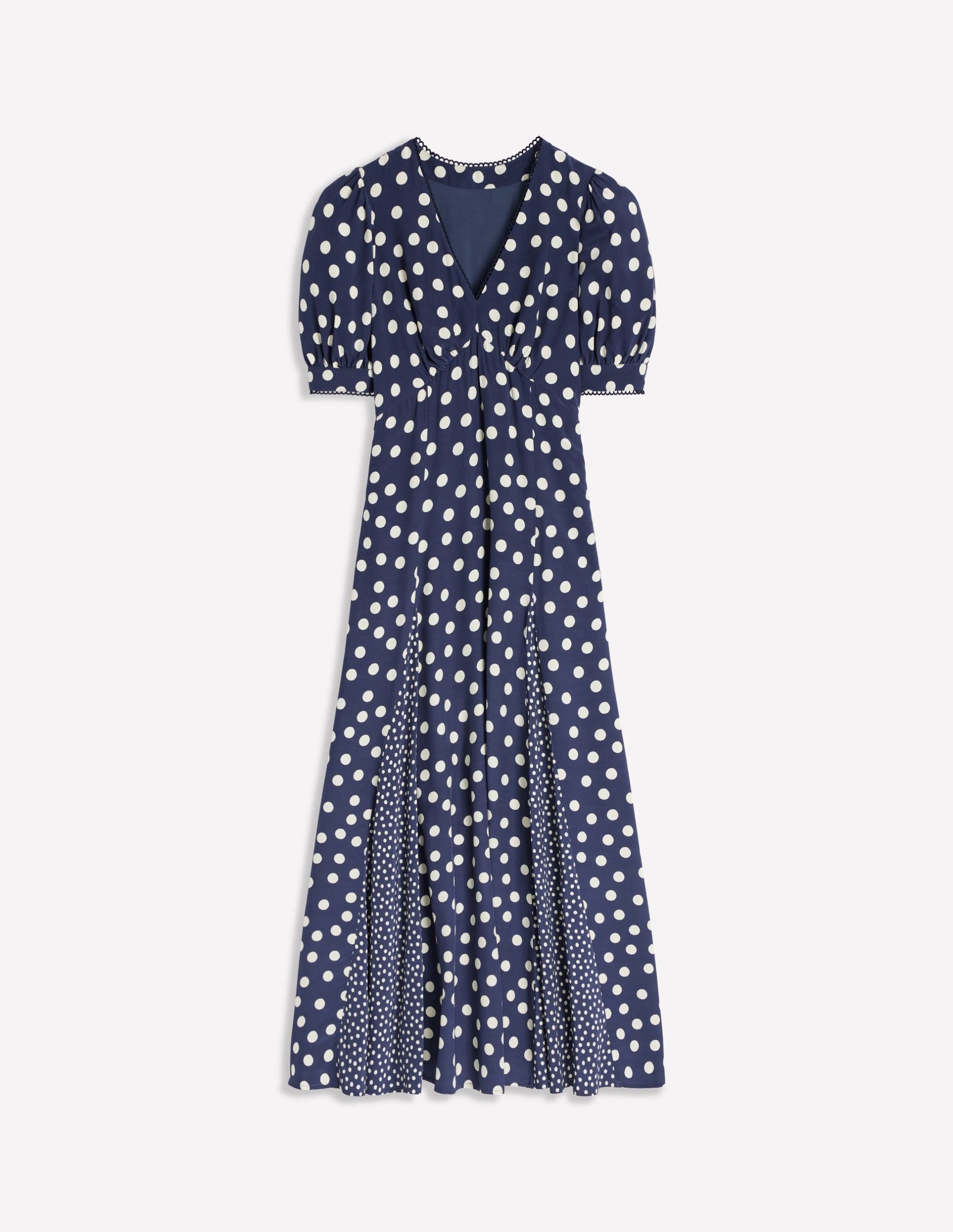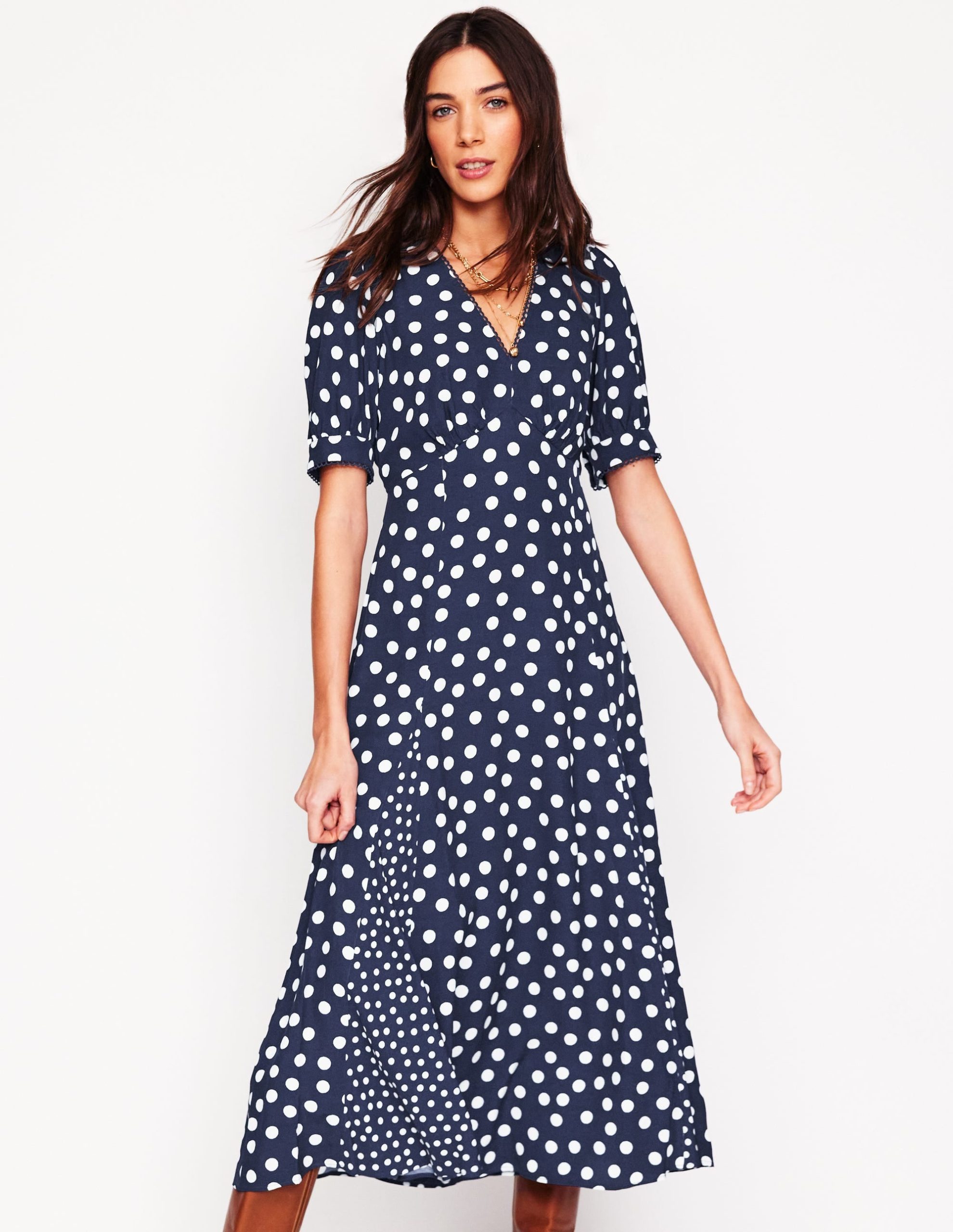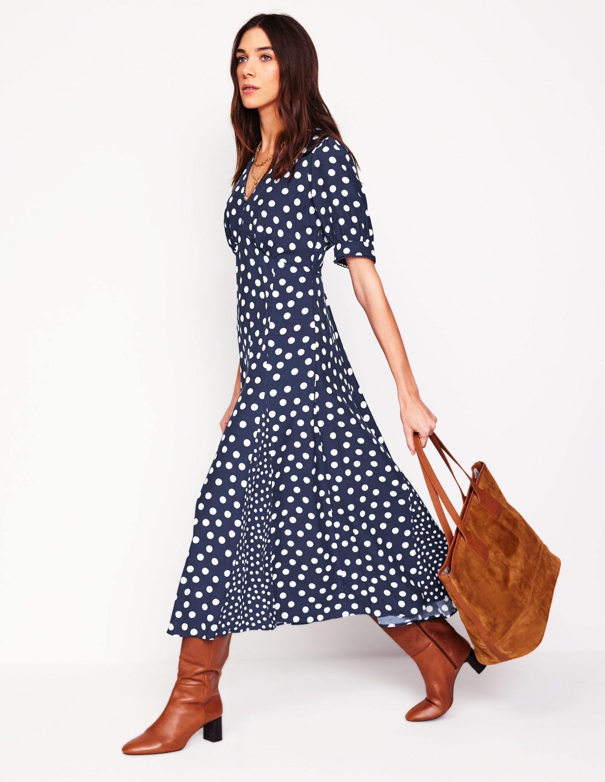 Rosie Godet Tea Dress-French Navy. Abstract Dot