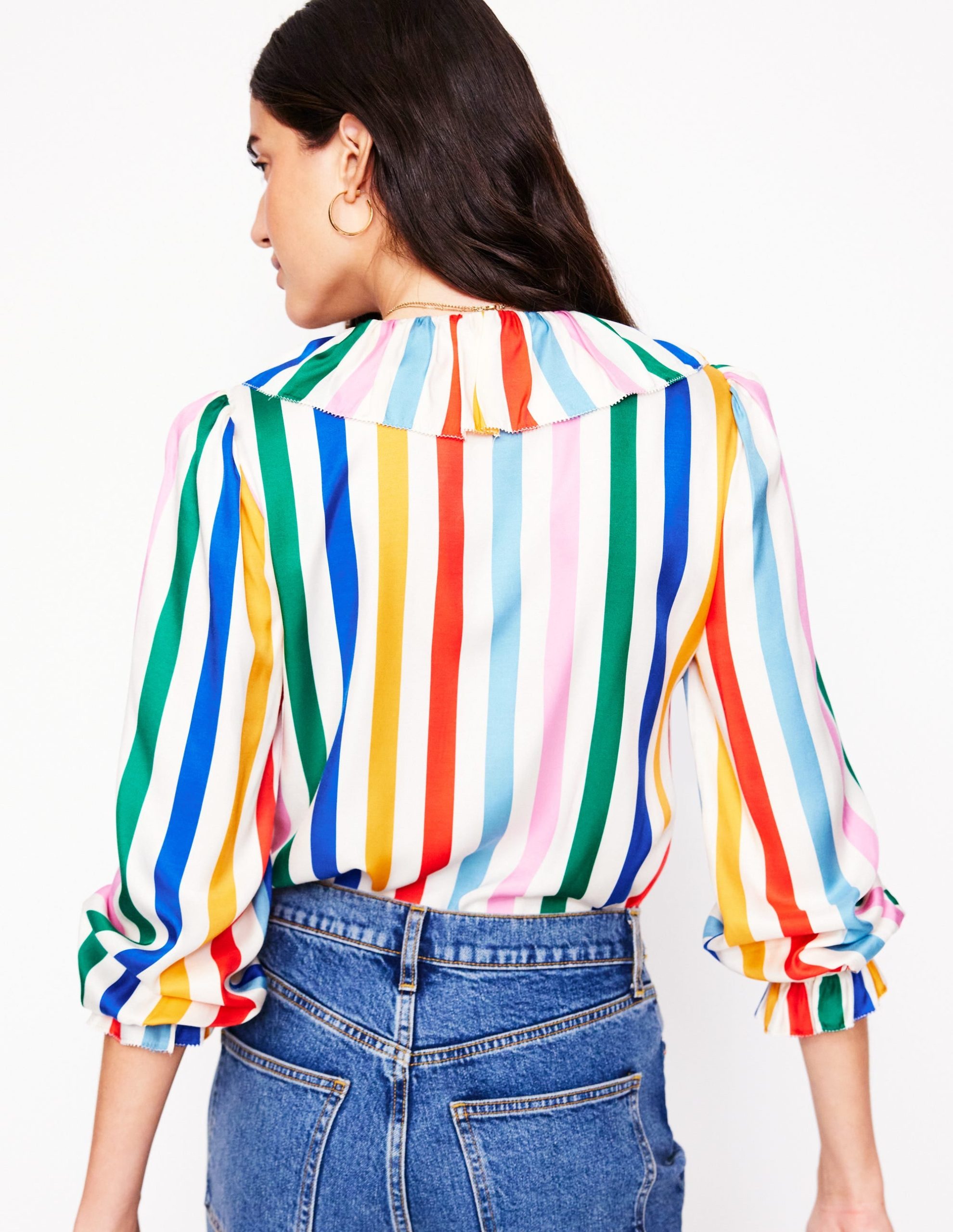 We dare you to ruffle a few feathers in this gorgeous silk blend top. The frothy neckline and cuffs will add a playful touch to any summer look.