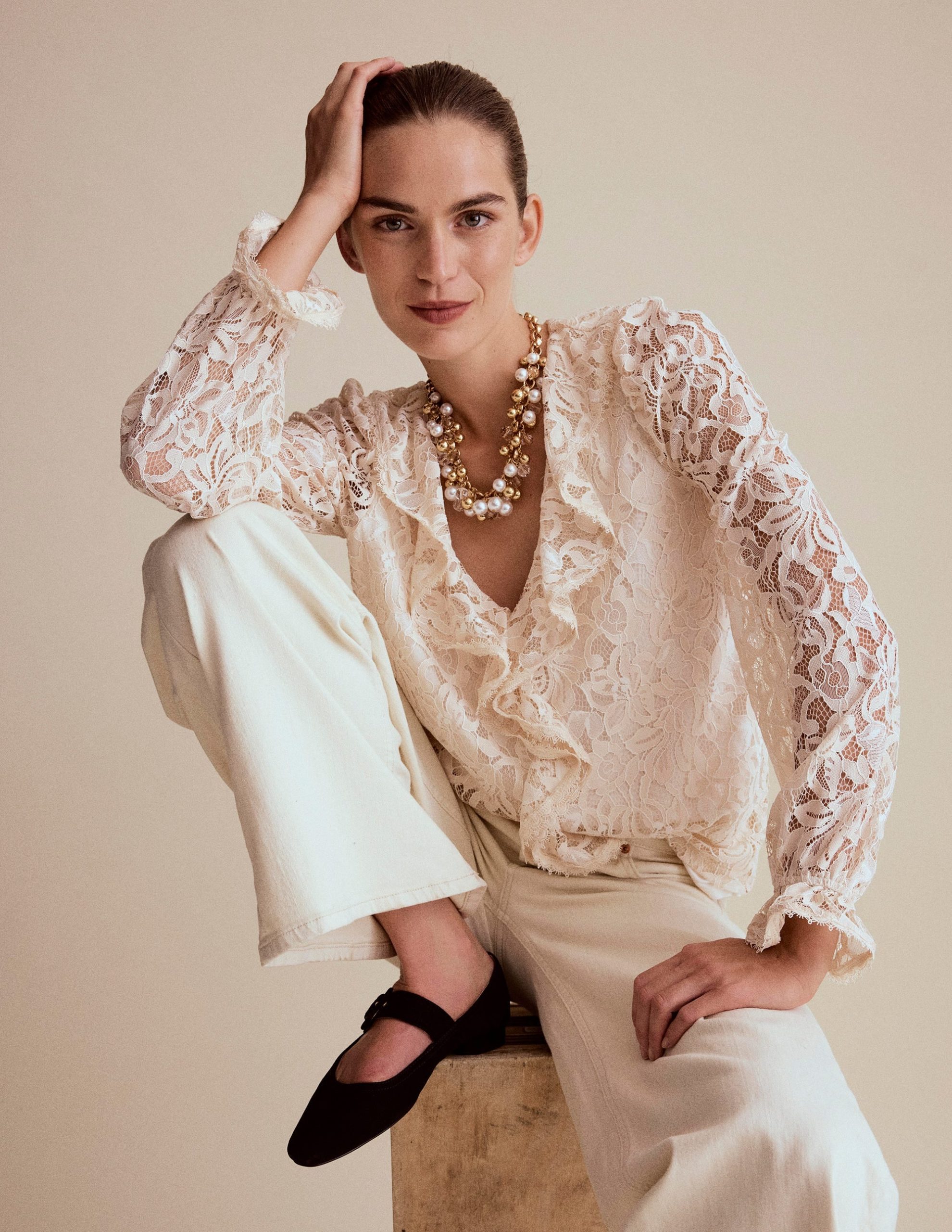 Whether peeking out from under a suit or worn alone with jeans. there’s something poetically undone about this lace frill blouse. It’s sensual without being obvious. and demands you take it out and show it the sights.