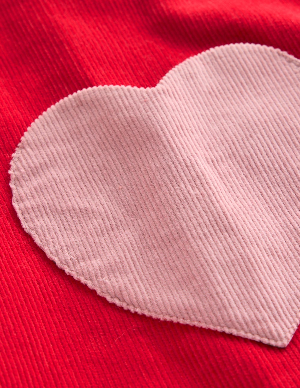 Celebrate the simple things in life like cute heart patch pockets that will hold small things Minis like to keep close. And this pinafore is cord. which equals cosy.
