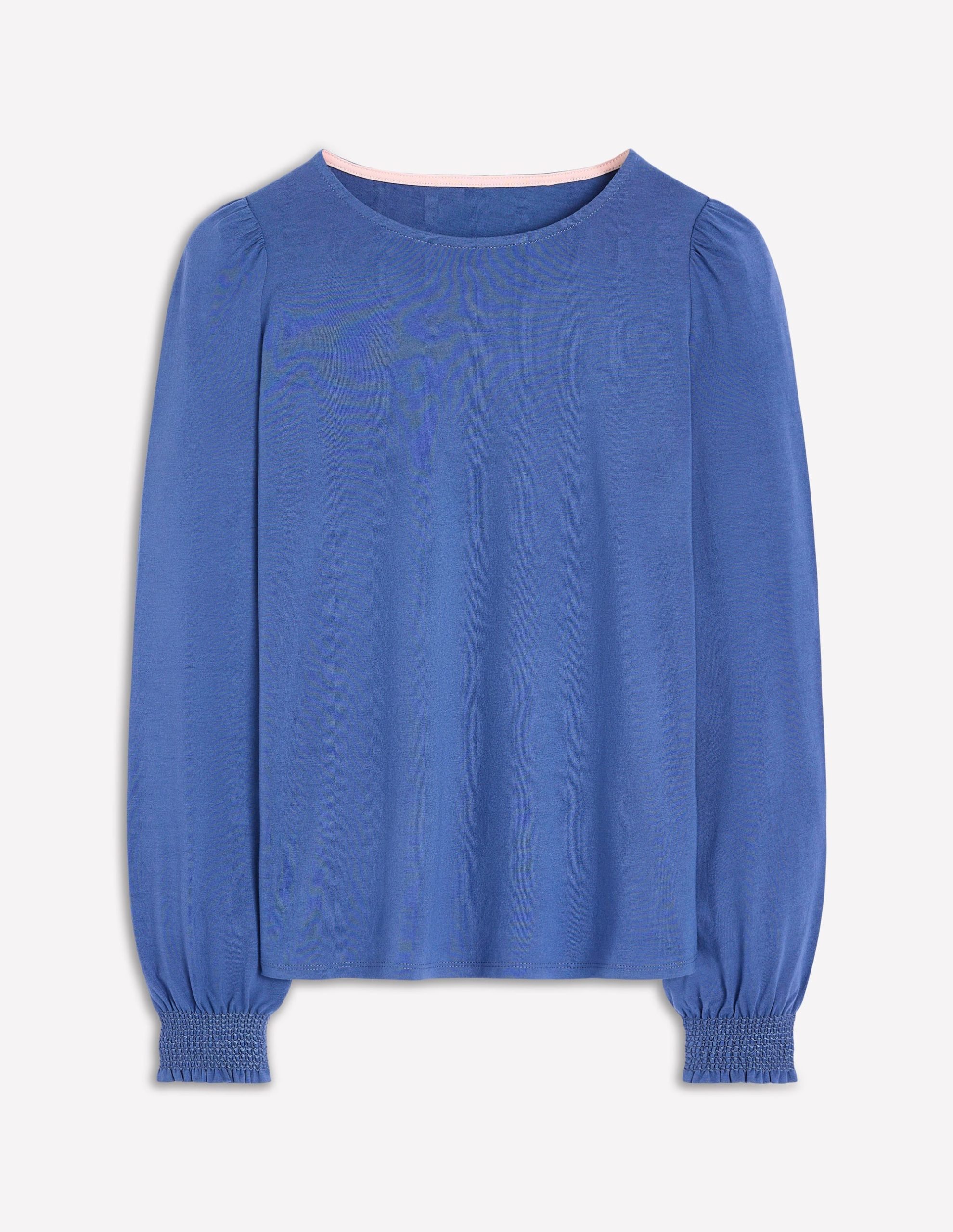 The smocked contrasting colour cuffs and supersoft cotton blend fabric give this basic a point of difference. Layer it under a knitted tank or wear alone tucked into high-rise jeans.