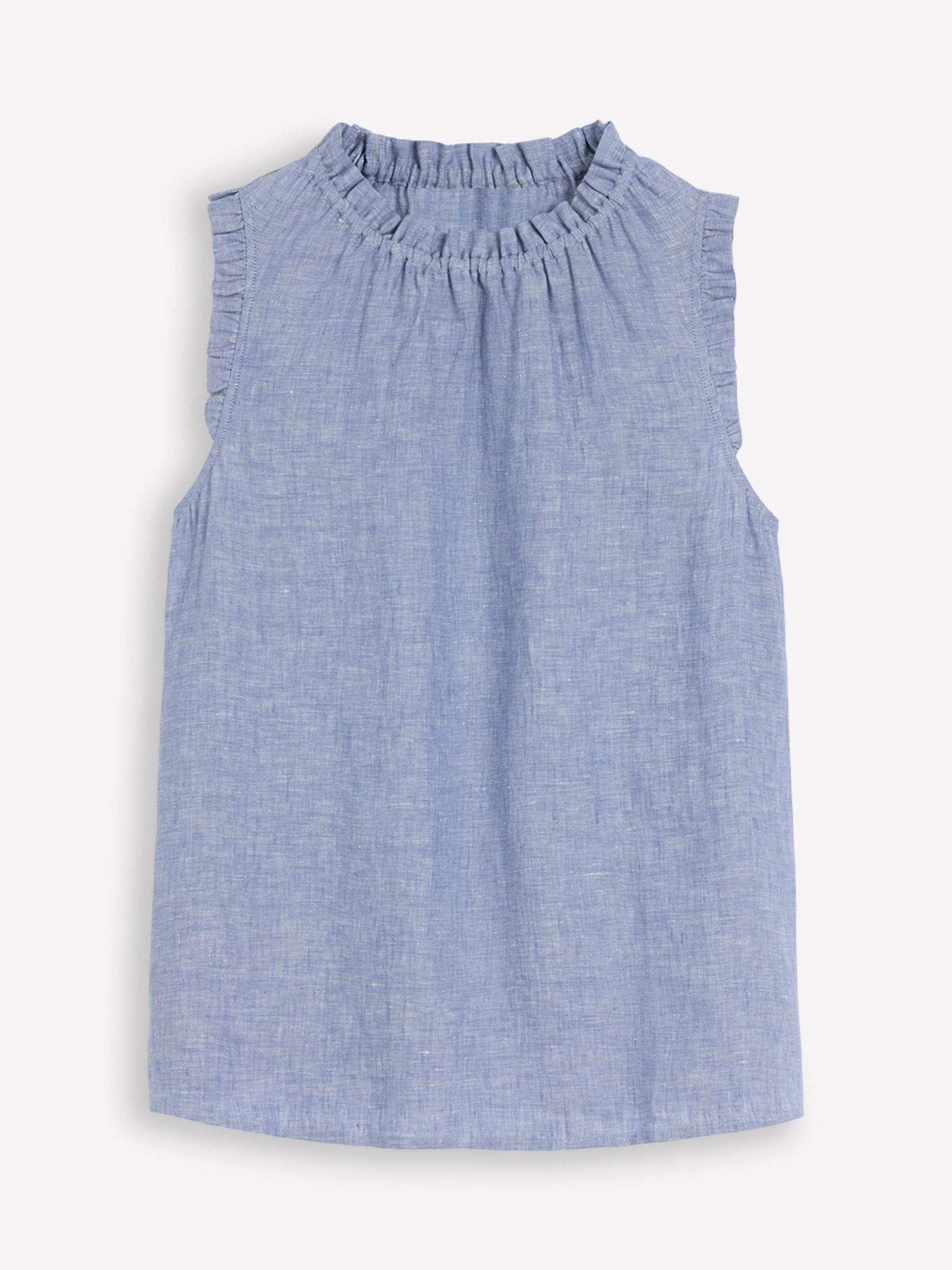 Our Sophie top is floaty and spun from cool. breathable linen. We’ve added ruffles at the shoulders and neck. too.