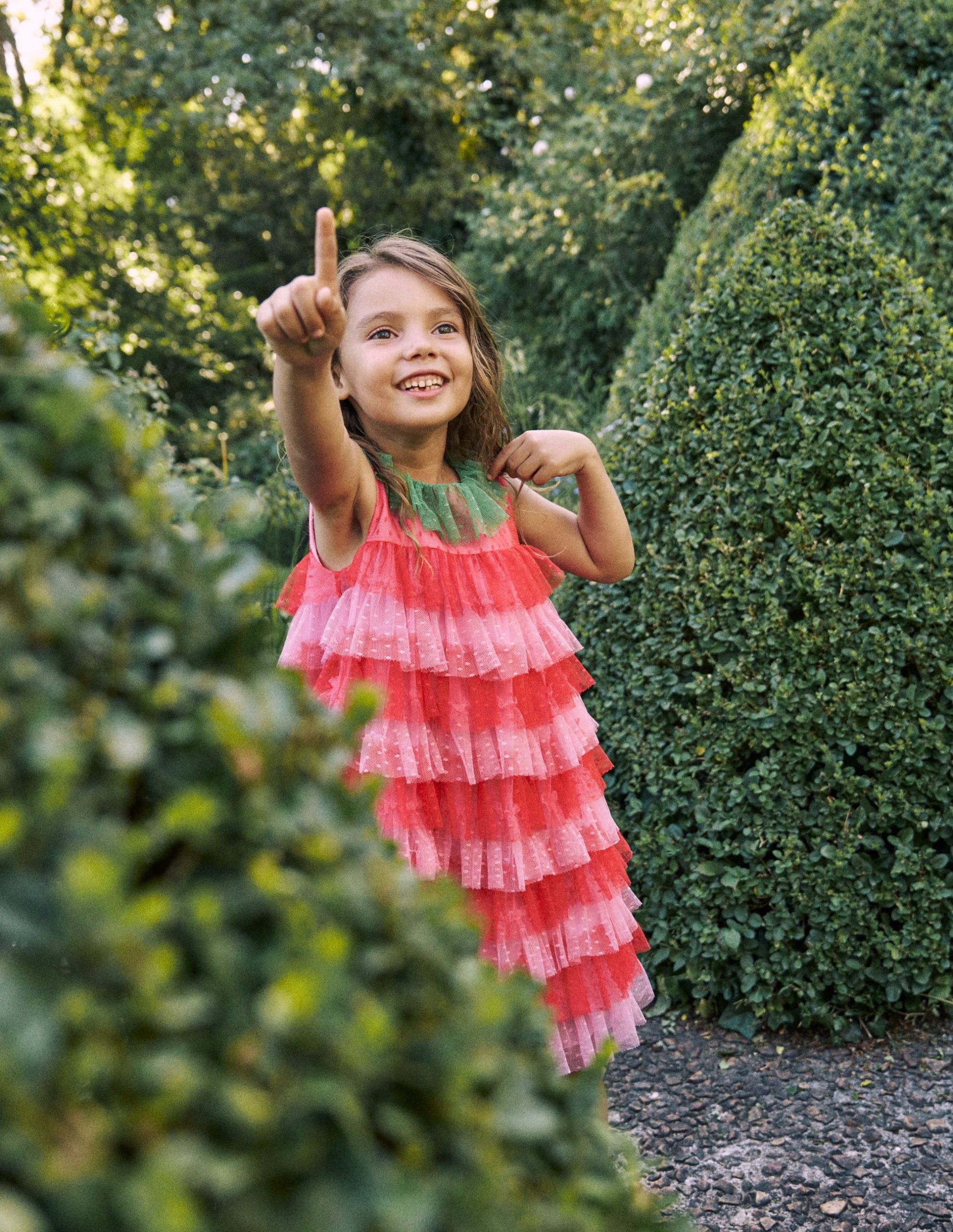 This colourful party dress couldn’t get any sweeter if it turned into a real strawberry. The 10 ruffles of tulle (we counted). a frilly neckline and soft lining make it berry exciting. Minis are free to pick their own now.