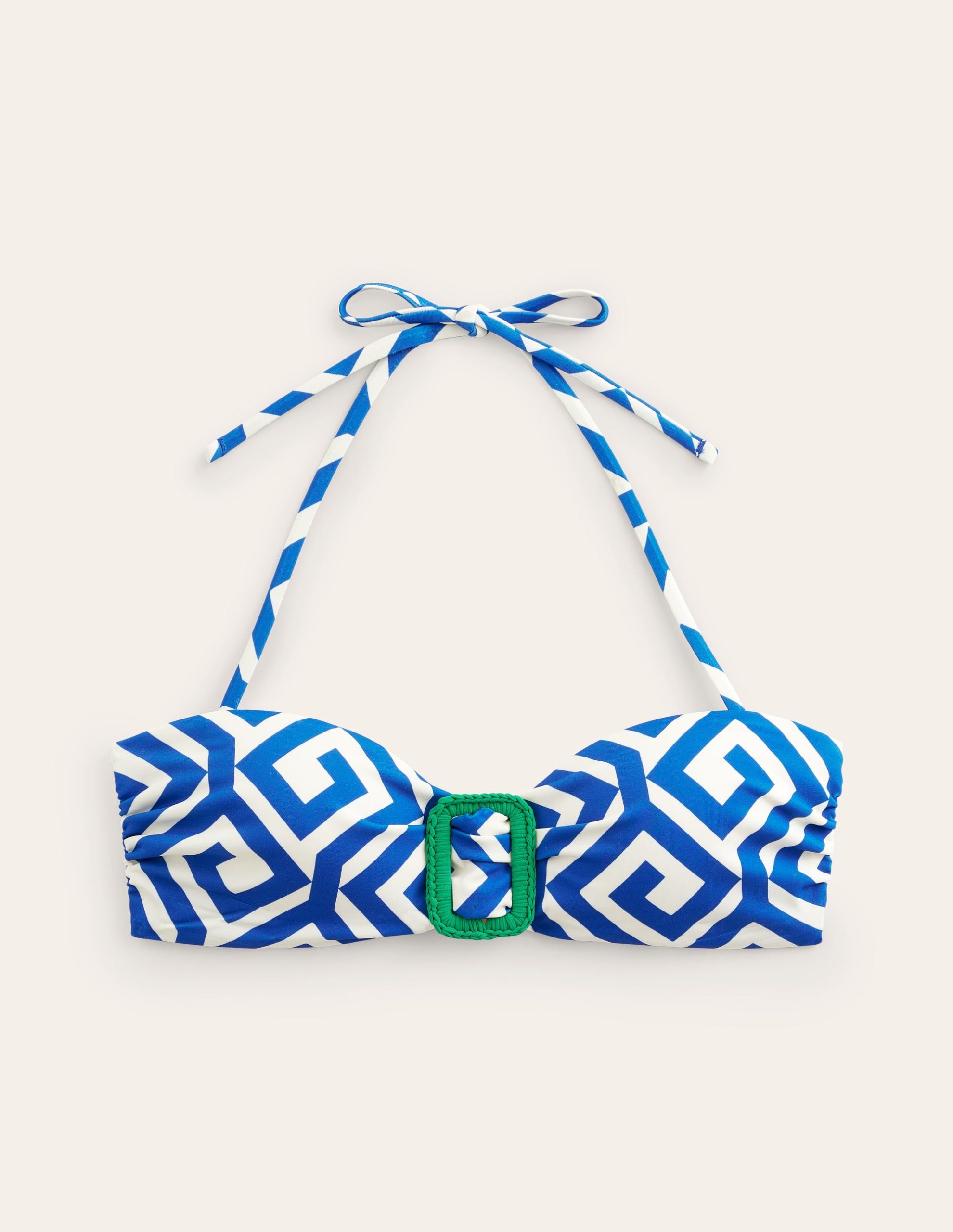 Silicone tape along the top and thick ties at the back give this bandeau bikini top extra support. The buckle detail offers a retro feel??play it up with oversized accessories.