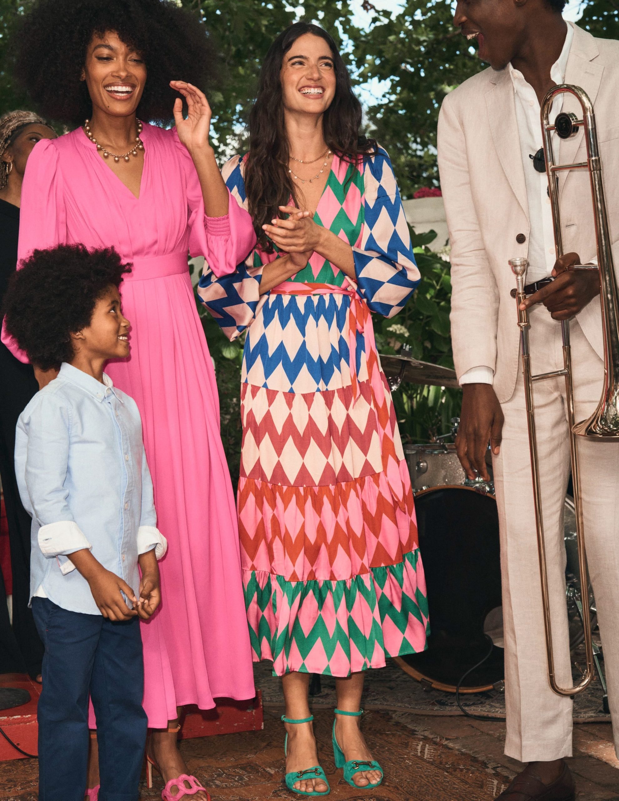 Everything about this dress sings of summer days (and nights). Balloon sleeves with cuffs. a flowy skirt with pockets and tie waist belt act as a blank canvas for the bold prints we love. V is for voil??.