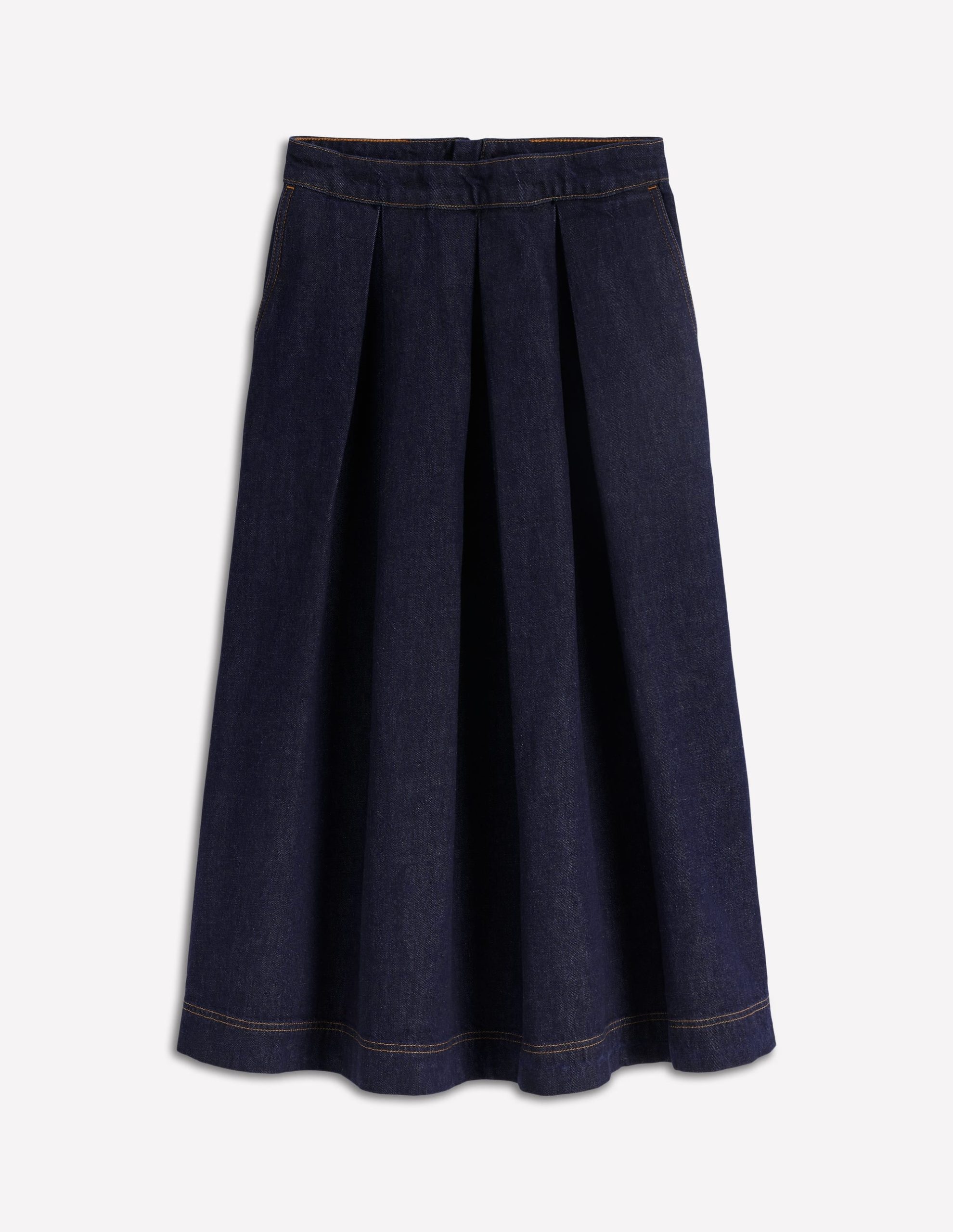 Our pleated Verity skirt pretty much gives you the license to twirl as an adult. Spun from classic wash denim. it’s elasticated at the back and easy to love.