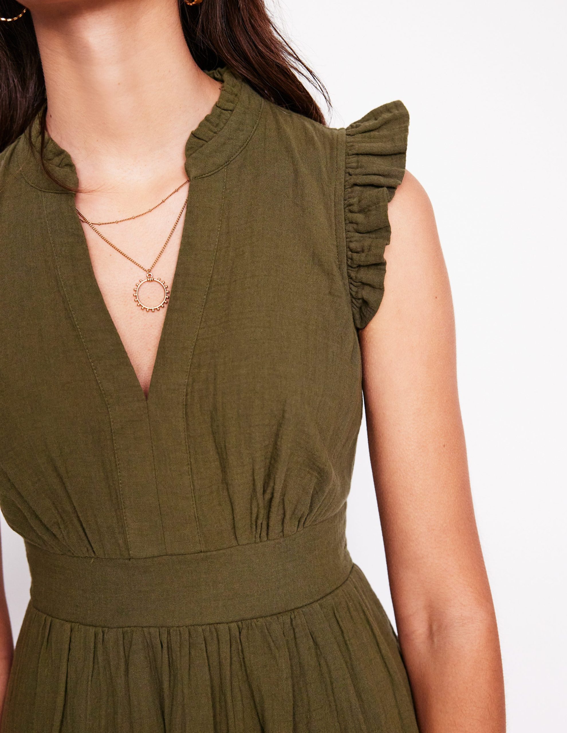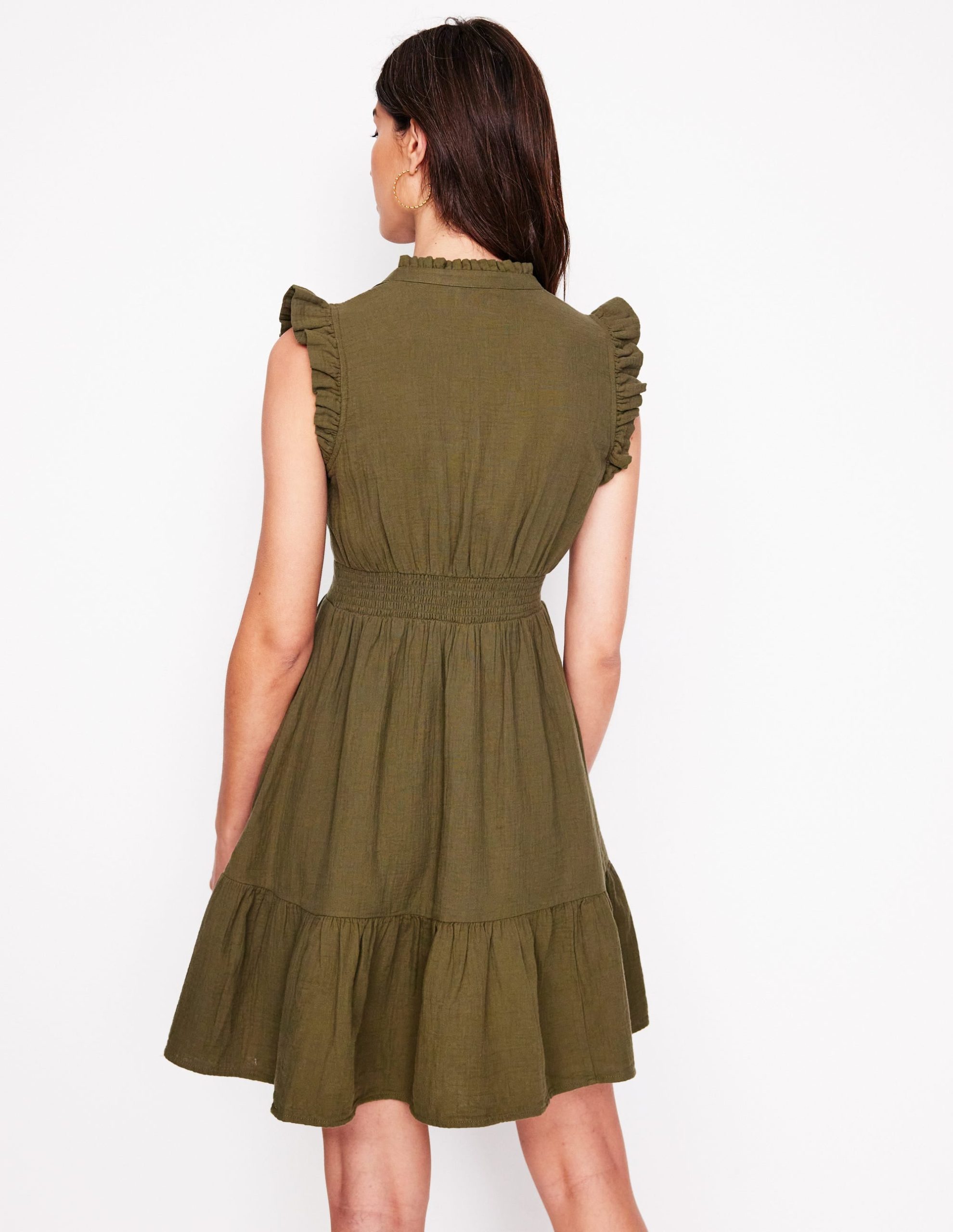Celebrate the sunshine in this light cotton dress with romantic ruffles. a short skirt with pockets and smocked back waist (to give a little stretch). A summer keeper.